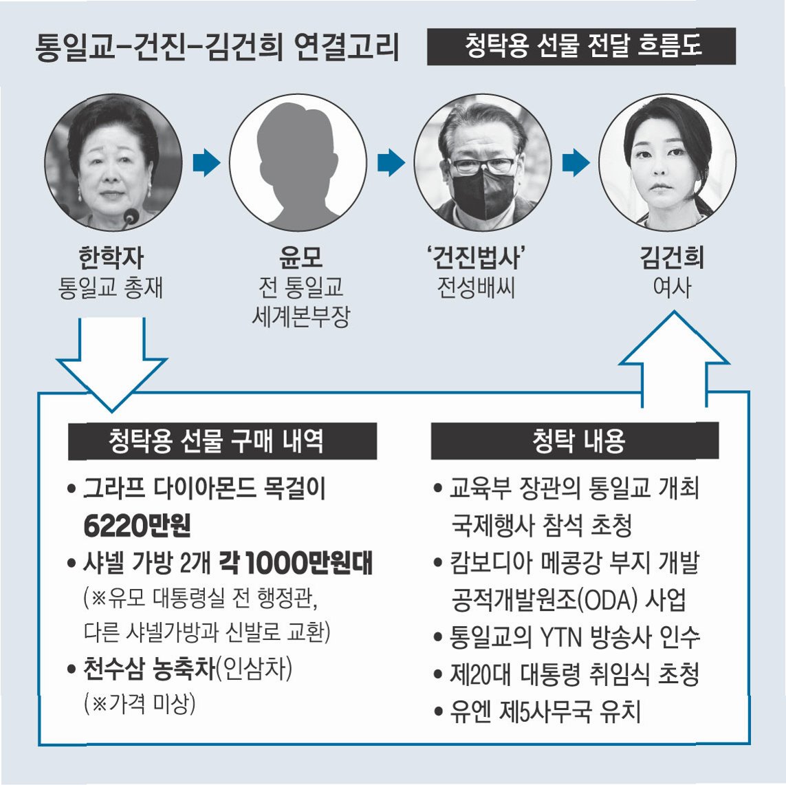 전 씨 측은 2022년 4~7월 통일교 전 세계본부장 윤영호 씨로부터 교단 지원 청탁을 받고 샤넬백과 천수삼농축차, 그라프 목걸이를 제공받아 유경옥 전 대통령실 행정관에게 전달한 사실을 인정했습니다. 그러나 사전 청탁이 없었고, 사후 청탁만 존재했기에 알선수재가 성립하지 않는다고 주장하고 있습니다.
