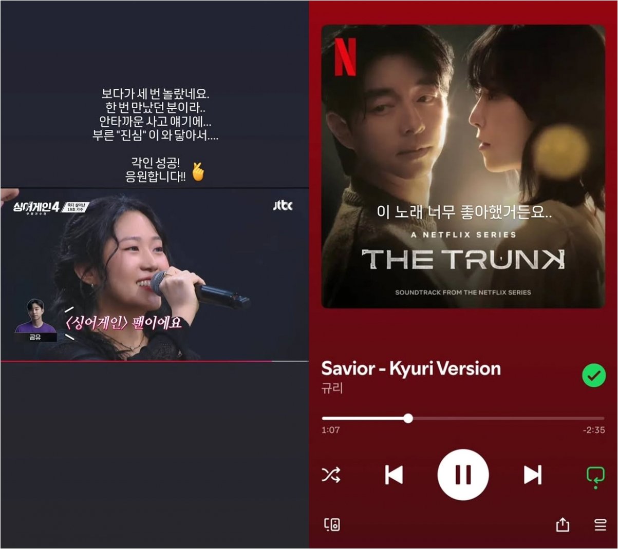 18호 가수는 공유가 출연한 넷플릭스 시리즈 '트렁크'의 OST 'Savior'를 부르면서 공유를 만난 적이 있습니다. 당시 공유는 '싱어게인'의 열렬한 팬임을 밝혔고, 18호 가수는 '내가 나가면 각인될 수도 있겠다'는 생각을 했다고 합니다. 이러한 특별한 인연이 공유의 응원으로 이어져 더욱 훈훈한 감동을 자아냈습니다.