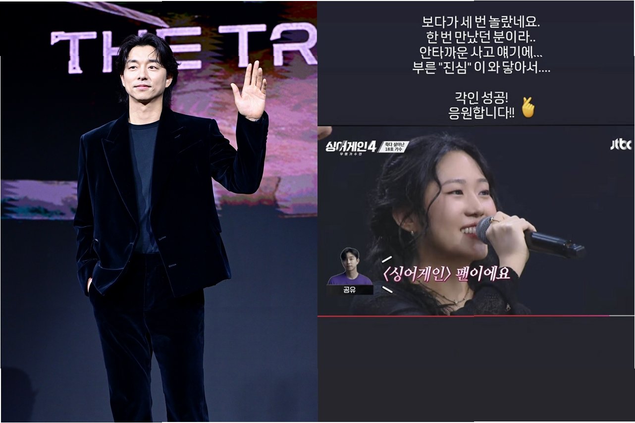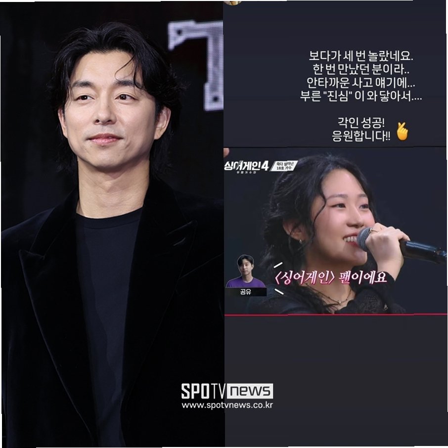 배우 공유가 JTBC '싱어게인4'에 출연한 18호 가수에게 따뜻한 응원을 보내 화제를 모으고 있습니다. 공유는 자신의 소셜 미디어(SNS)를 통해 18호 가수의 무대를 보고 받은 감동을 표현하며, 그의 용기와 도전을 응원했습니다. 공유의 진심 어린 메시지는 많은 시청자들에게도 긍정적인 영향을 주고 있습니다.