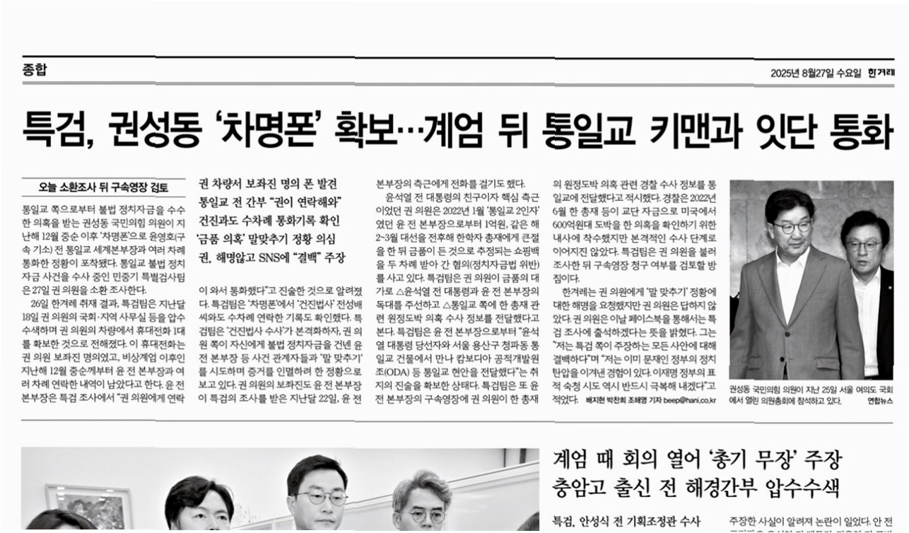 국민의힘 권성동 의원이 통일교 관련 불법 정치자금 수수 의혹과 관련하여 '차명폰'을 사용했다는 정황이 포착되어 파장이 일고 있습니다. 특검팀은 권 의원의 차량에서 압수수색을 통해 확보한 휴대전화에서 윤영호 전 통일교 세계본부장과 여러 차례 통화한 기록을 확인했습니다. 이 사건은 단순한 의혹 제기를 넘어, 정치권의 은밀한 거래와 증거 인멸 시도 가능성을 제기하며 국민적 관심과 우려를 동시에 불러일으키고 있습니다.