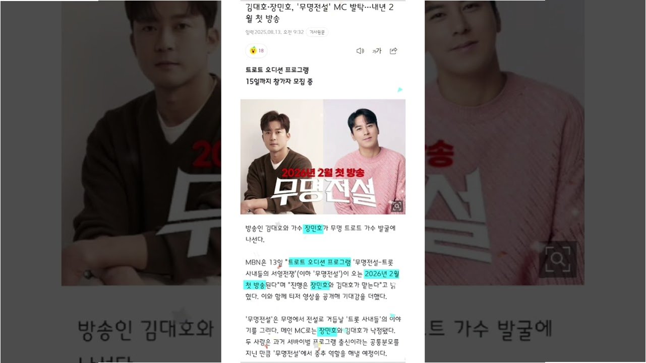 MBC 퇴사 후 출연료가 150배나 껑충 뛴 김대호 아나운서가 트로트 오디션 MC로 새로운 도전을 시작합니다. MBN의 초대형 트롯 오디션 프로그램 '무명전설-트롯 사내들의 서열전쟁'에서 그는 장민호와 함께 메인 MC로 활약할 예정이며, 벌써부터 많은 이들의 기대를 한 몸에 받고 있습니다.