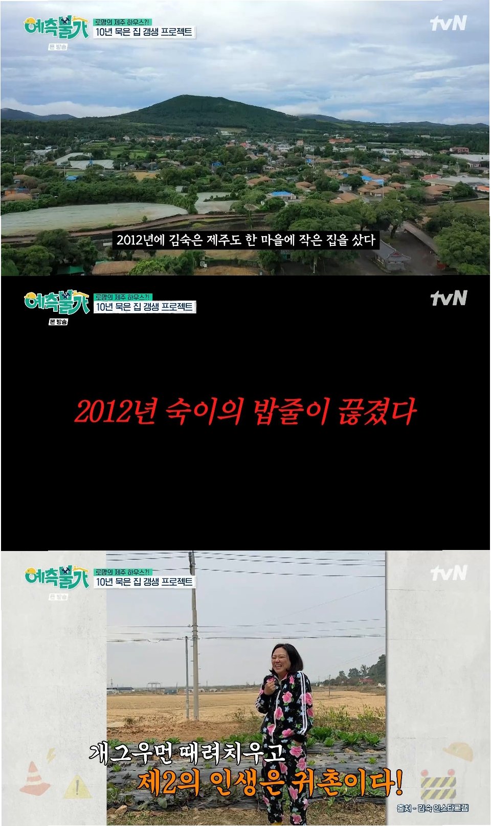 방송인 김숙이 10년 묵은 제주 하우스를 고쳐 쓰기 위해 세컨 하우스를 마련한 이유를 밝혔다. 2012년, 방송계에서 일에 치이는 힘든 시기를 겪던 김숙은 제주도로 귀촌을 결심하고 집을 매입했다. 당시 '일을 여기저기 다 잘리고 이리 치이고, 저리 치이고 있을 때'라는 그녀의 고백은 많은 이들의 공감을 자아냈다.