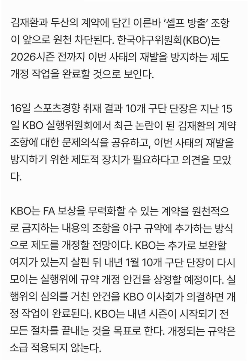 10개 구단 단장은 지난 15일 KBO 실행위원회에서 최근 논란이 된 김재환의 계약 조항에 대한 문제의식을 공유하고, 이번 사태의 재발을 방지하기 위한 제도적 장치가 필요하다고 의견을 모았다.