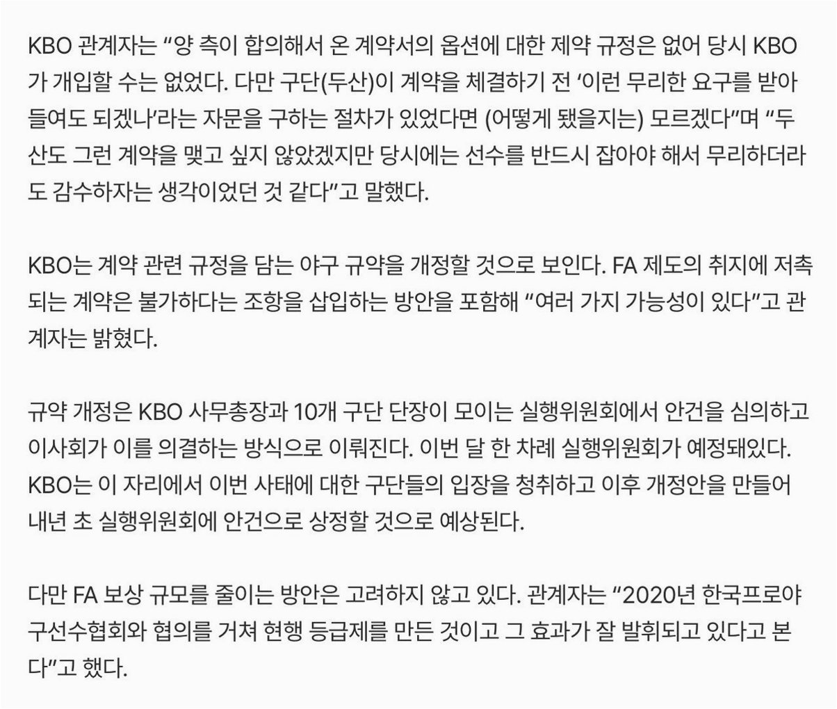 KBO 관계자는 “두산과 김재환의 계약처럼 FA 보상을 무력화하는 사례는 일단 원천적으로 막는 게 맞다고 본다. 다른 것도 혹시 보완할 수 있는 부분이 있는지는 조금 더 고민해보기로 했다”고 말했다.
