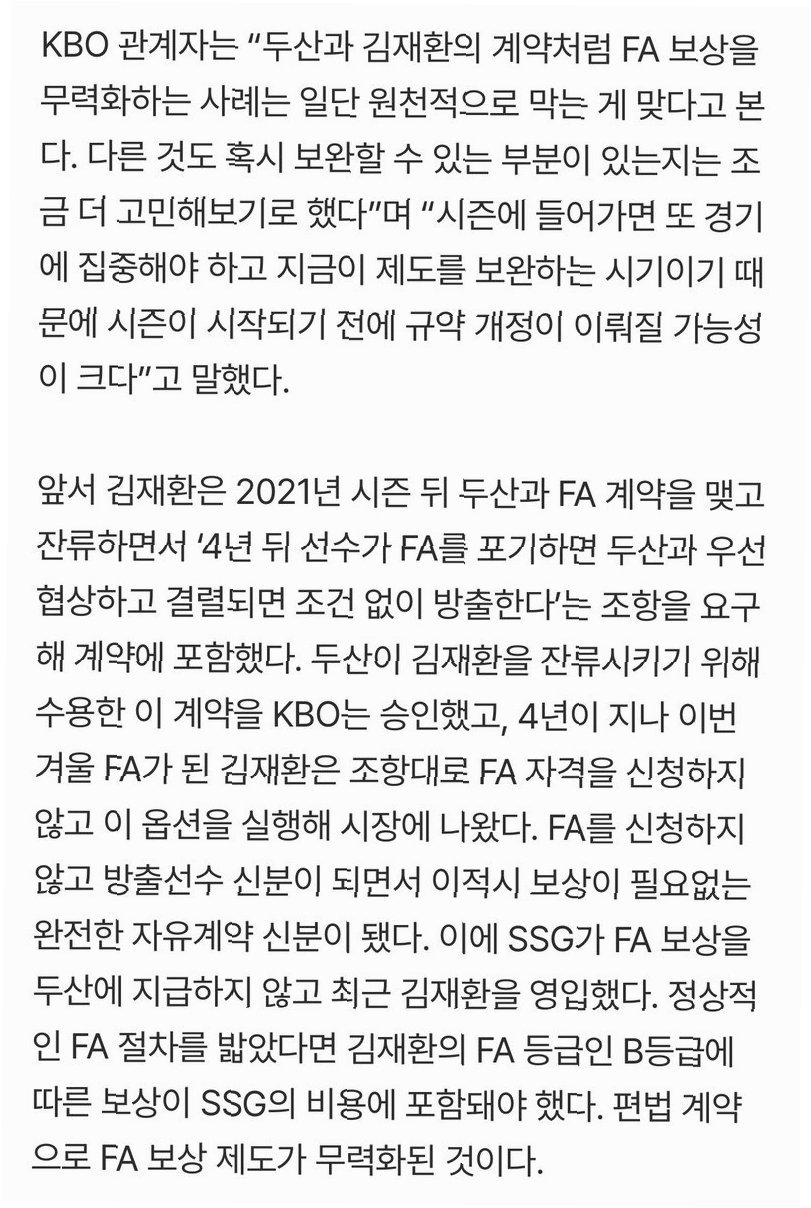KBO 관계자는 “두산과 김재환의 계약처럼 FA 보상을 무력화하는 사례는 일단 원천적으로 막는 게 맞다고 본다. 다른 것도 혹시 보완할 수 있는 부분이 있는지는 조금 더 고민해보기로 했다”고 말했다.