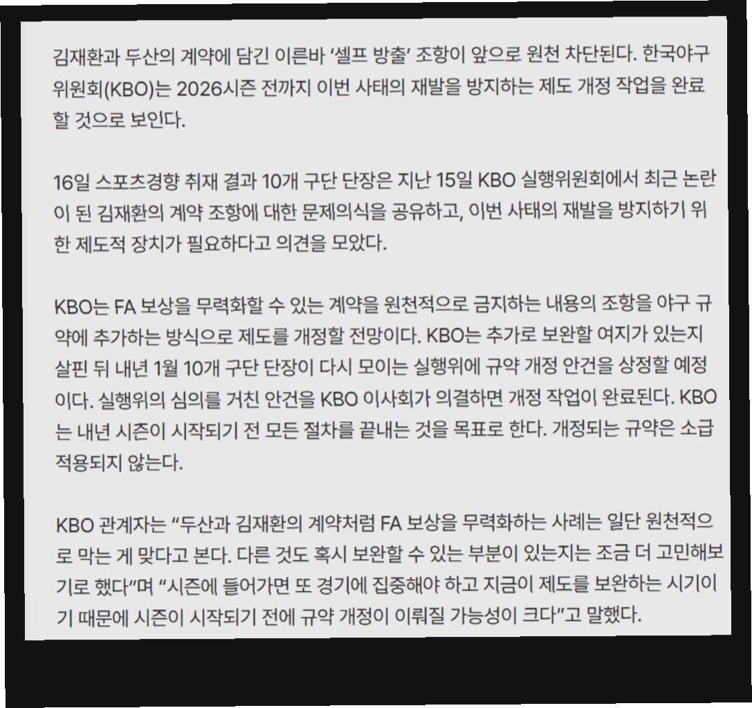 KBO가 김재환의 '셀프 방출' 계약을 막기 위해 규약 개정을 추진, FA 보상 무력화 시도를 원천 차단하고 리그의 공정성을 강화하려는 움직임이다.