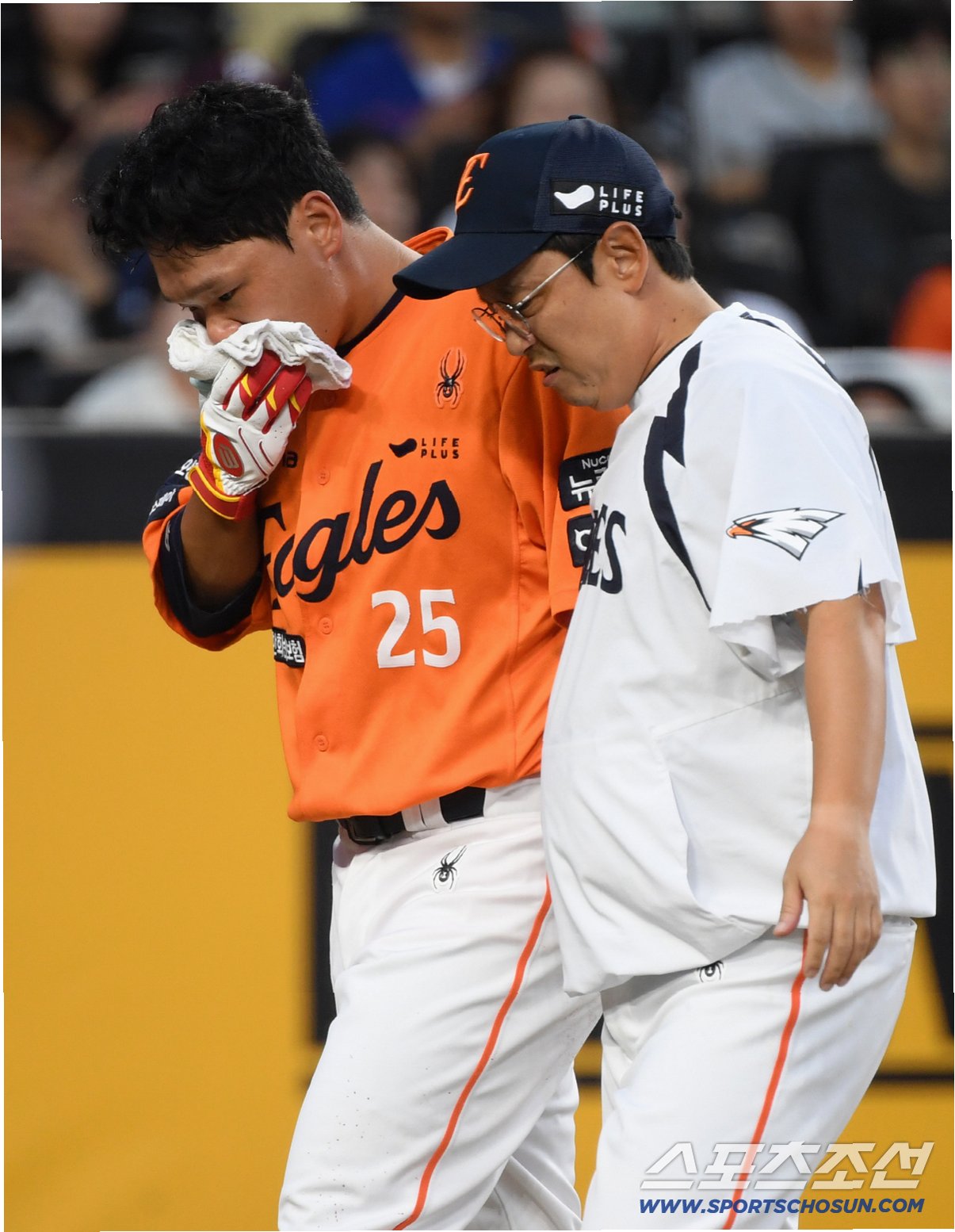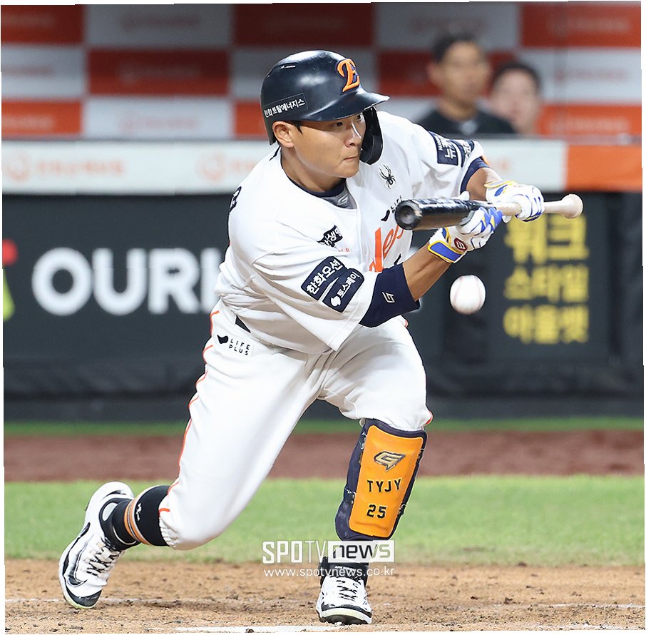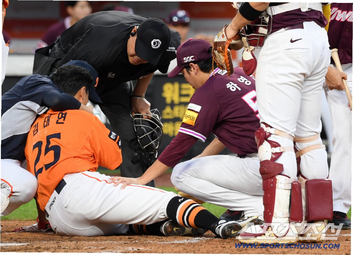 김태연은 보내기 번트 동작을 취했는데 하영민의 초구 시속 140km 직구가 얼굴로 날아들었다.