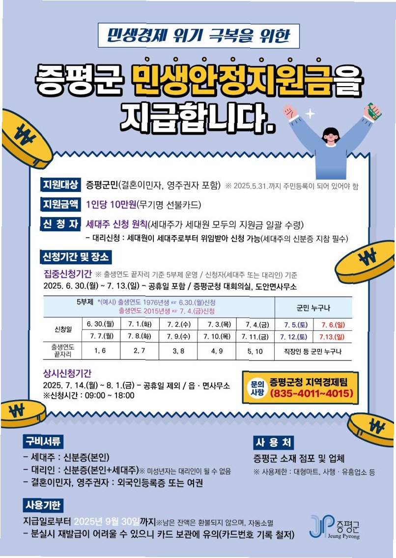 민생안정지원금과 관련된 추가적인 정보나 궁금한 사항은 거주하시는 읍·면사무소에 문의하시면 친절하게 안내받으실 수 있습니다. 단양군은 군민들의 편의를 위해 최선을 다하고 있으며, 앞으로도 군민들의 삶의 질 향상을 위한 다양한 정책을 추진할 것입니다. 많은 관심과 참여 부탁드립니다.