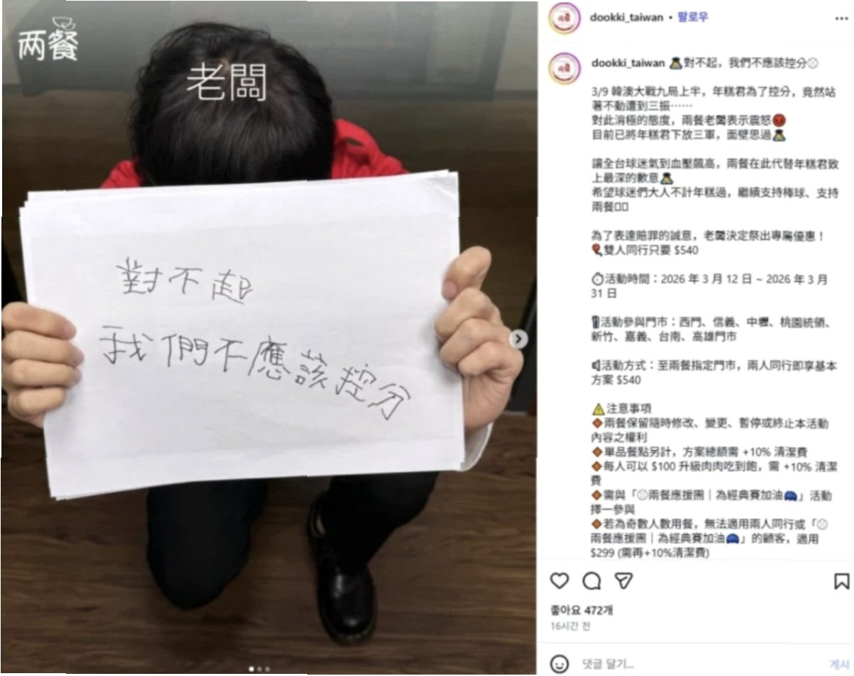 두끼 대만 법인은 공식 SNS에 '한국이 점수를 이상하게 줘서 미안하다. 조작해서 미안하다'는 문구와 함께 무릎 꿇는 이미지를 게시했습니다. 이는 지난 8일 WBC 조별리그에서 대만이 한국에 5-4로 승리한 경기 결과를 조롱하는 의도로 해석되었습니다. 특히 무릎 꿇는 이미지는 대만 현지에서 비아냥거리는 의미로 통용되는 밈으로 확인되어, 단순한 현지 맞춤 마케팅으로 치부하기 어려운 수준입니다.