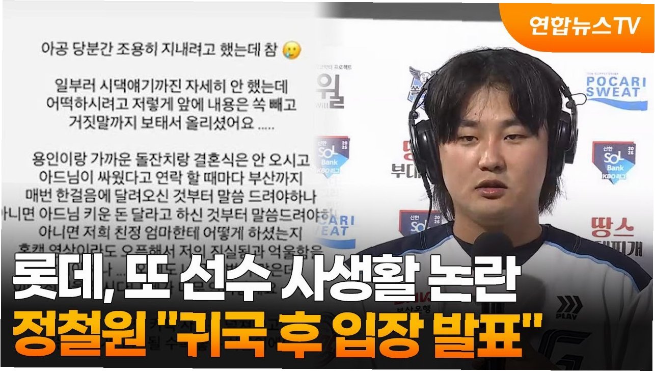 롯데 자이언츠의 정철원 선수가 시즌 개막 전 사생활 논란에 휩싸였습니다. 아내 김지연 씨의 폭로로 이혼 소송 사실이 알려졌으며, 정 선수는 귀국 후 공식 입장을 밝힐 예정입니다. 팬들은 과거 나균안 선수의 사례를 떠올리며 구단의 반복되는 문제에 우려를 표하고 있습니다.