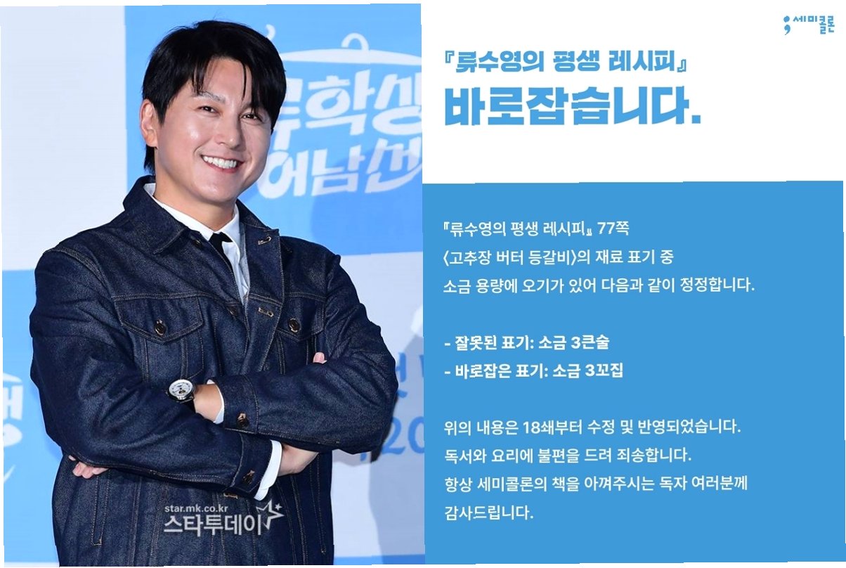 류수영의 요리책에서 치명적인 오류가 발견되었습니다. '고추장 버터 등갈비' 레시피의 소금 용량이 실제보다 과다하게 표기되었던 것입니다. 소금 3큰술이 소금 3꼬집으로 정정되어야 했지만, 오랜 기간 동안 잘못된 레시피가 책에 실렸습니다. 이로 인해 많은 독자들이 '어쩐지 짜더라'는 반응을 보이며 유쾌한 해프닝으로 받아들였습니다. 이 오류는 18쇄부터 수정 및 반영되었습니다.
