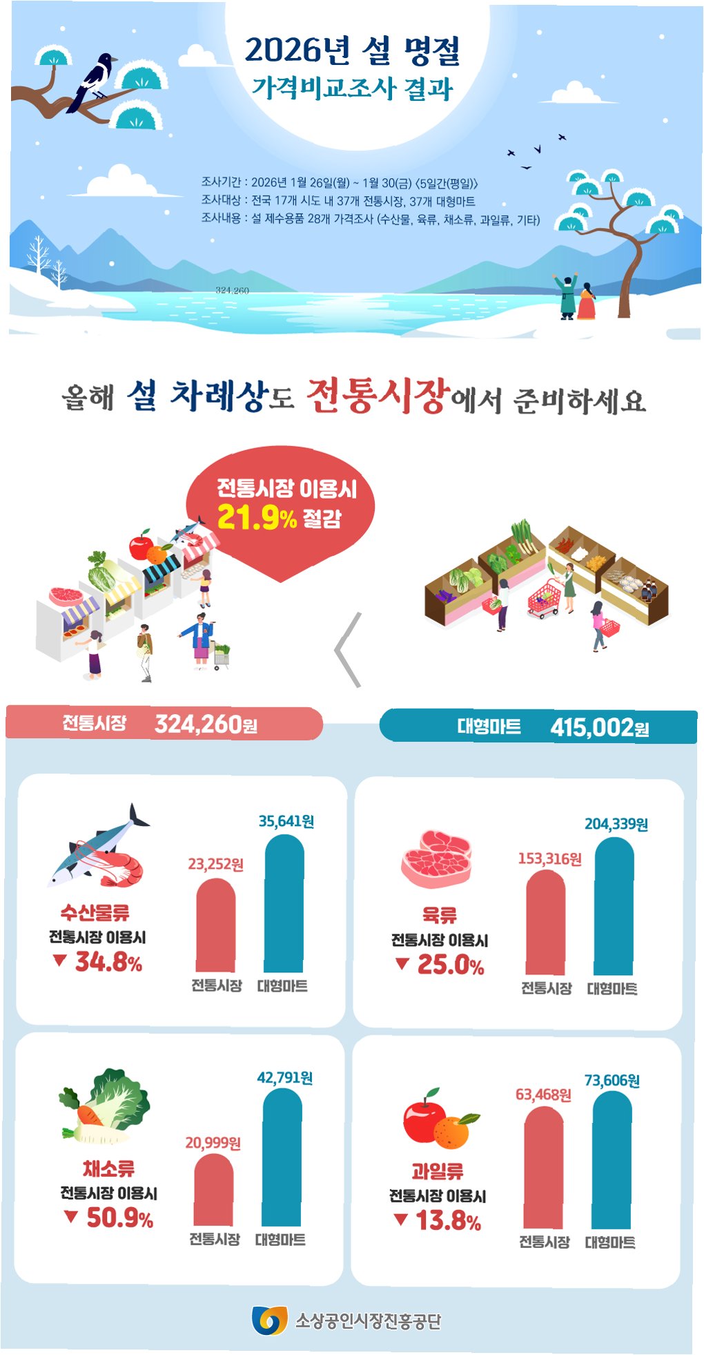 A.전통시장에서 차례상을 준비하는 비용은 23만3782원으로 전년 대비 4.3% 상승했으며, 대형마트는 27만1228원으로 4.8% 올랐습니다. 품목별로 차이가 있으니 비교가 필요합니다.