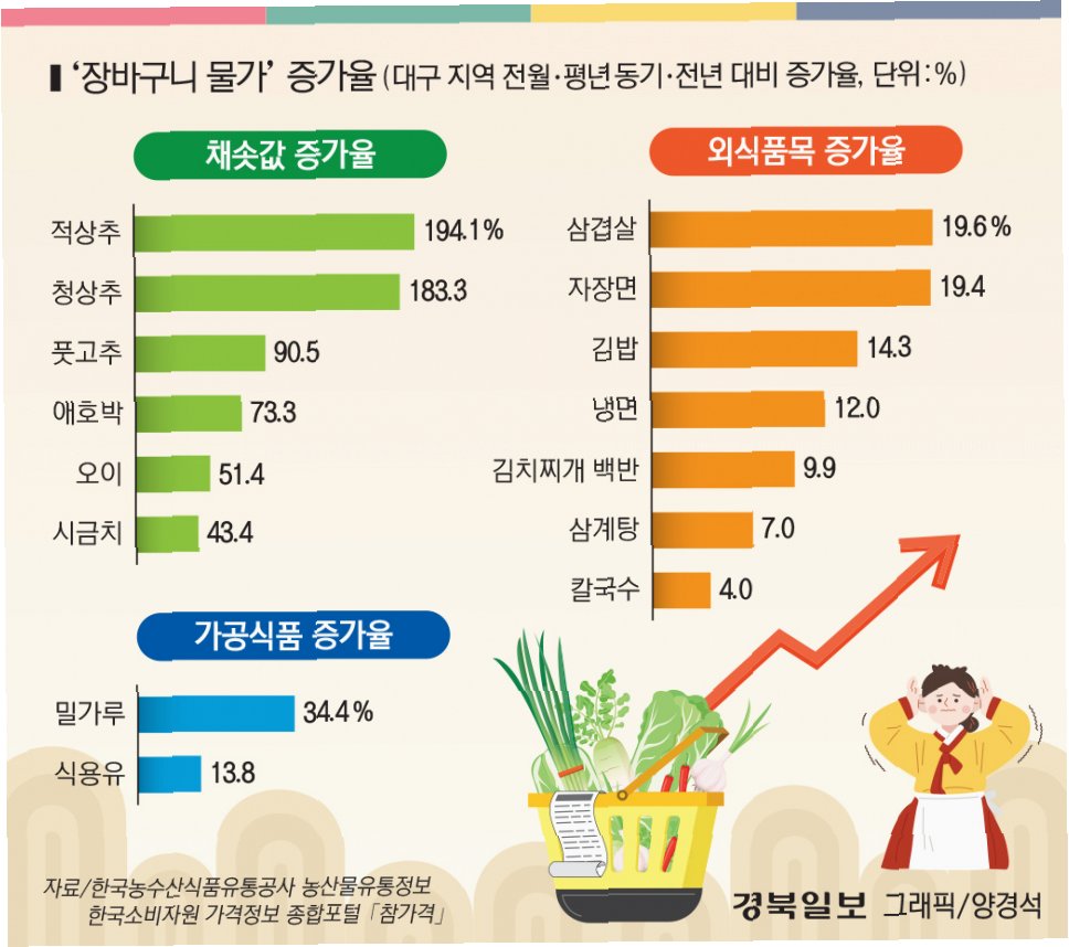 설을 앞둔 대구 칠성시장에서 만난 시민 김현숙(62)씨는 제사상에 올릴 음식 준비 비용이 예년보다 5만원 가량 늘어난 25만원 정도 들 것 같다고 토로했습니다. 특히 한우와 사과는 가격이 크게 올라 명절 준비에 부담을 더하고 있습니다. 전통시장에서 차례상을 준비하는 데 드는 비용은 전년 대비 4.3% 상승한 23만3782원이며, 대형마트는 4.8% 오른 27만1228원으로 조사되었습니다.