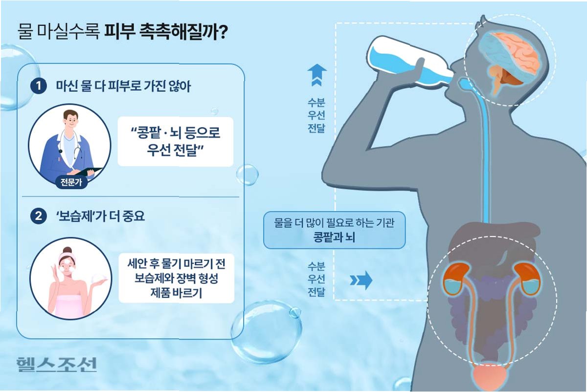 물을 많이 마시는 것만으로는 피부가 촉촉해지진 않습니다. 피부의 촉촉함은 단순히 피부 속 수분량에 달려 있는 것이 아니라, ‘피부 장벽’의 건강도에 달려 있기 때문입니다피부 장벽은 외부 자극으로부터 피부를 보호하고, 피부 속 수분이 증발하는 것을 막는 중요한 역할을 합니다정상적인 수분 상태의 사람은 물을 더 마셔도 피부에 직접적인 변화를 느끼기 어렵습니다. 탈수 상태일 때는 물 섭취가 피부 톤과 탄력 개선에 일시적 효과를 줄 수 있지만, 과도한 수분 섭취는 오히려 저나트륨혈증을 유발하여 무력감, 메스꺼움, 심한 경우 뇌부종을 일으킬 수 있습니다.