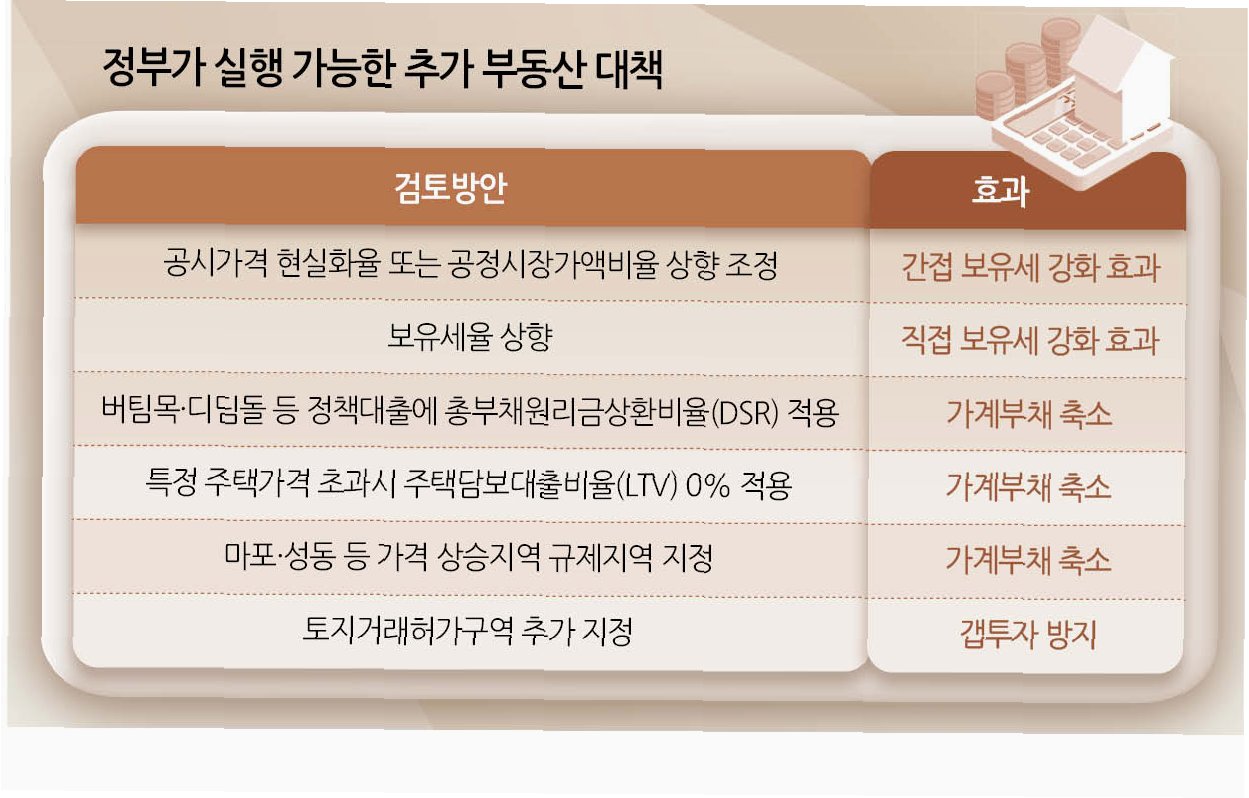 A.서울 및 경기도 지역의 투기과열지구 및 조정대상지역 확대, 고가 주택 대출 규제 강화, 갭투자 방지를 위한 전세대출 DSR 포함 등이 예상됩니다.