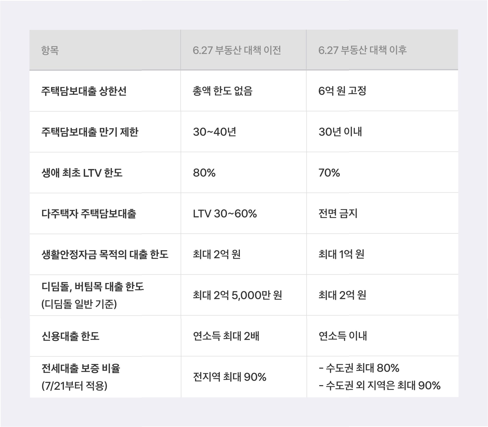 정부는 3차례에 걸쳐 주택담보대출 한도를 축소하고, 규제 지역 내 LTV를 낮추는 등 부동산 대책을 발표했습니다. 서울 강남권과 경기 일부 지역을 규제 지역으로 확대하고, 1주택자에 대한 전세대출 이자 상환금을 DSR에 포함하는 조치도 시행했습니다.