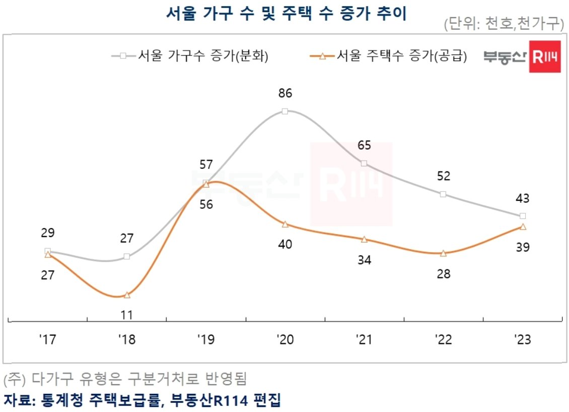 서울의 주택 공급이 가구 수 증가 속도를 따라가지 못하면서, 주택 부족 문제가 심화되고 있다는 분석이 나왔습니다. 부동산 리서치업체 부동산R114의 분석에 따르면, 최근 3년간 서울의 연평균 가구 수 증가량은 5만 3000가구 수준이었지만, 주택 수 증가량은 3만 3000가구에 그쳤습니다. 이는 연간 2만 가구의 초과 수요가 발생했음을 의미하며, 서울 집값 상승의 주요 원인으로 작용하고 있습니다. 1인 가구 증가 등 가구 수 증가 요인과 주택 공급 부족이 맞물려, 서울의 주택 시장 불안정성은 더욱 커지고 있습니다.
