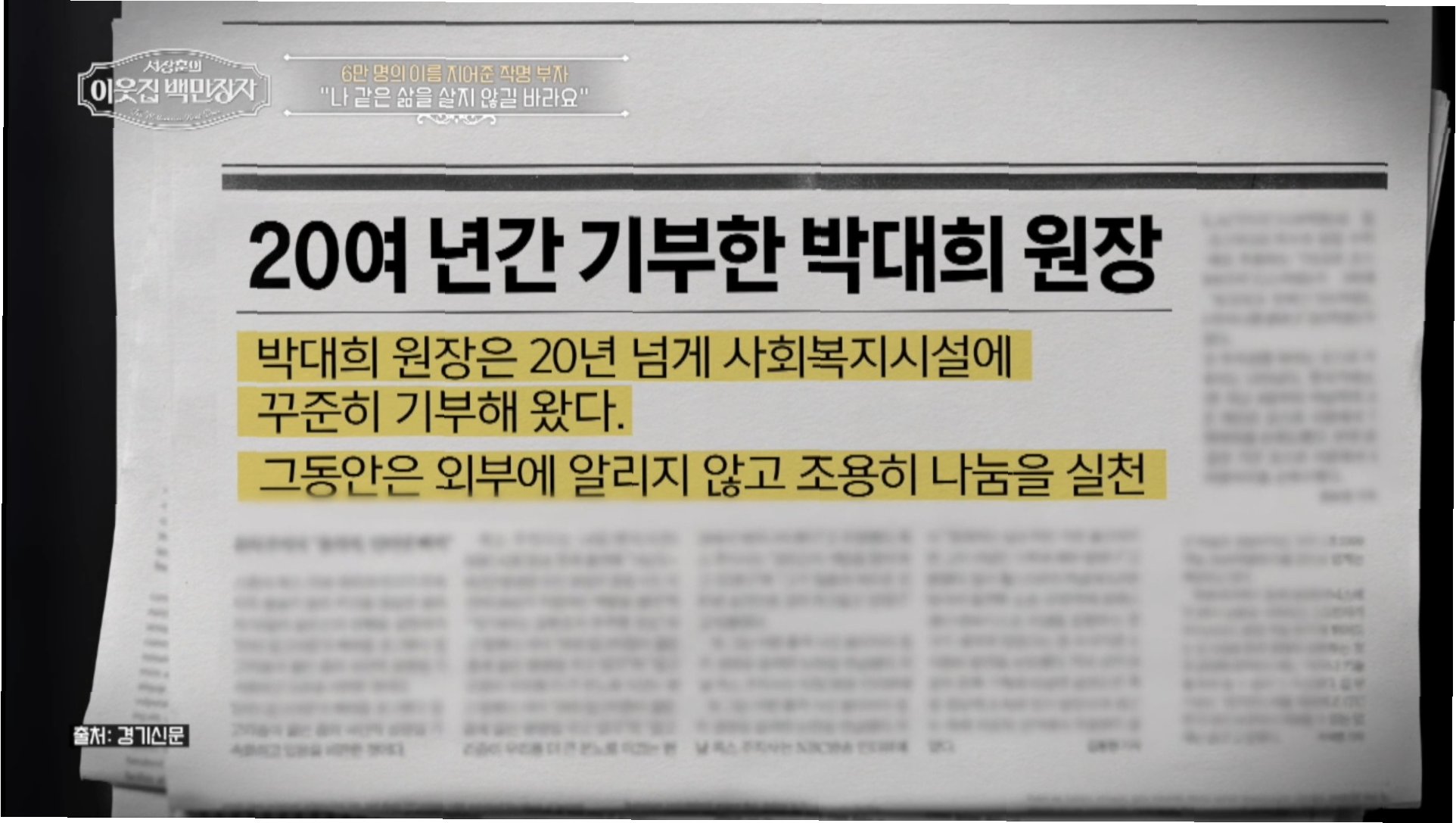 박대희는 어려운 아이들을 위해 20년 넘게 꾸준히 기부를 이어오고 있습니다. '형편이 어려워서 공부를 못했던 저와 같은 아이들이 없기를 바란다'는 마음으로 입학금과 장학금을 지원하고 사회복지시설에도 도움을 주고 있습니다. 특히 대치동 건물에서 나오는 월세를 따로 모아 어려운 아이들을 위한 재단 설립을 준비 중이라고 밝혀, 서장훈으로부터 '정말 대단하시다'는 감탄을 자아냈습니다. 또한, 시청과 연계하여 저소득층 가정 아이들의 이름을 지어주는 재능 기부도 하고 있으며, 보육원 아이들의 이름도 지어주는 방안을 모색하고 있다고 밝혀 훈훈함을 더했습니다.