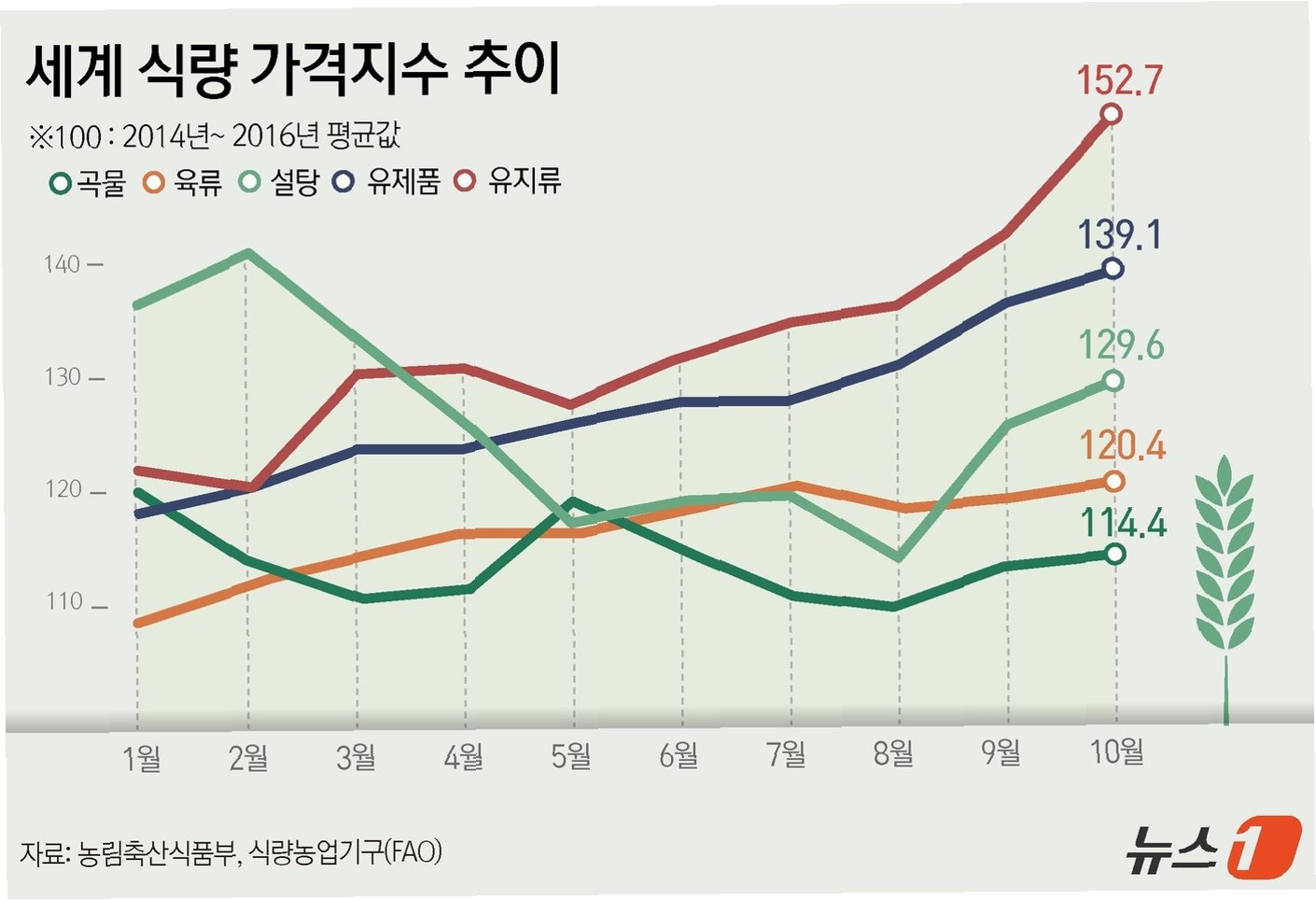 긍정적인 소식만 있는 것은 아닙니다. 곡물 가격은 105.5로 전달보다 1.8% 상승했습니다. 중국의 수요 증가 가능성과 흑해 지역의 지정학적 긴장이 밀 가격을 끌어올렸고, 옥수수 가격 역시 수요 강세와 아르헨티나, 브라질의 기상 악화로 인해 상승했습니다. 곡물 가격 상승은 빵, 면 등 곡물을 주식으로 하는 식품의 가격 상승으로 이어질 수 있으며, 이는 취약 계층의 식량 불안을 심화시킬 수 있습니다. 국제 정세의 불안정성이 식량 가격에 미치는 영향에 대해 지속적인 관심과 모니터링이 필요합니다.