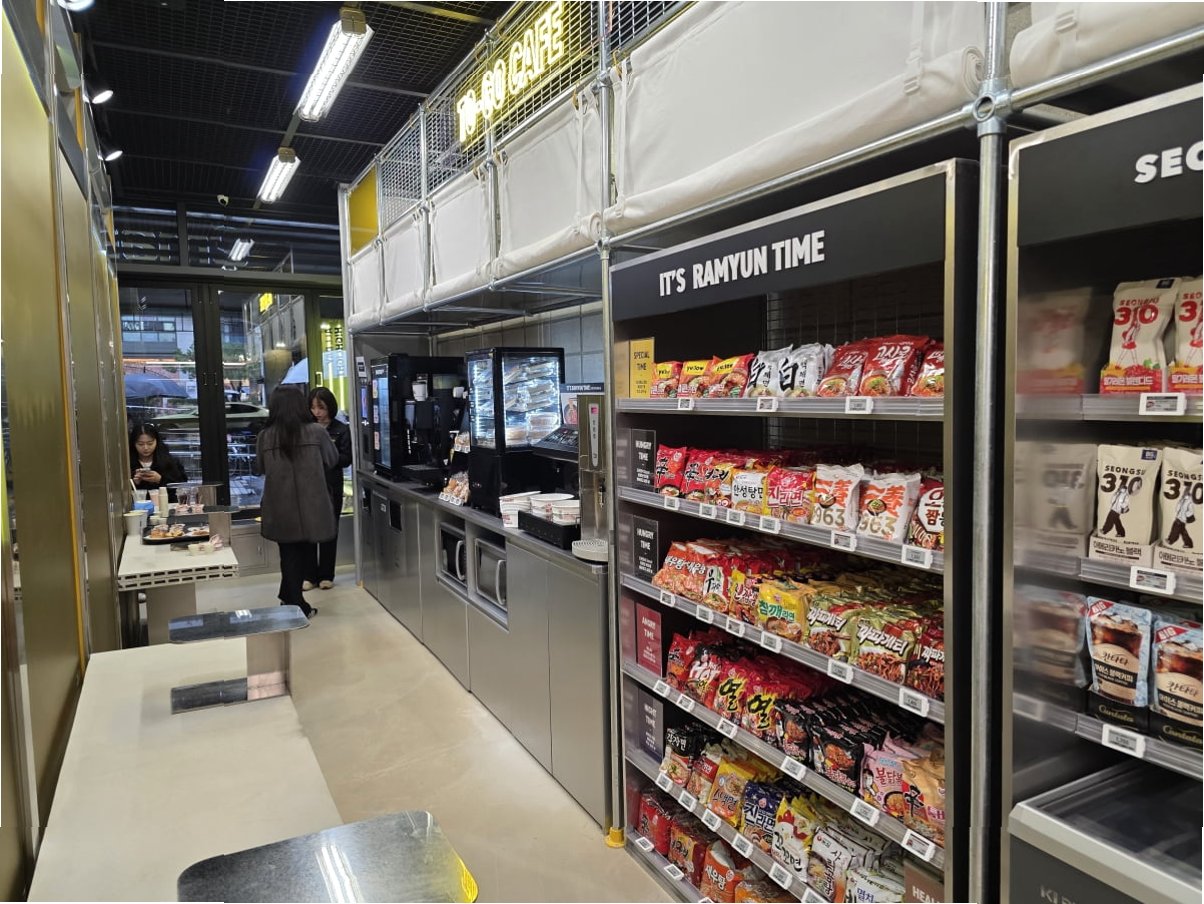 서울 지하철 2호선 성수역 4번 출구 앞, 이마트24가 약 100㎡(약 30평) 규모로 새로운 형태의 편의점을 선보이며 성수동 상권을 뒤흔들고 있습니다. 미래 비전과 새로운 고객 수요를 실험하는 '트렌드 플랫폼' 역할을 하는 매장으로, 단순한 판매점을 넘어 이마트24가 지향하는 브랜드의 정체성과 비전을 압축해 보여주는 실험 공간이라 할 수 있습니다.