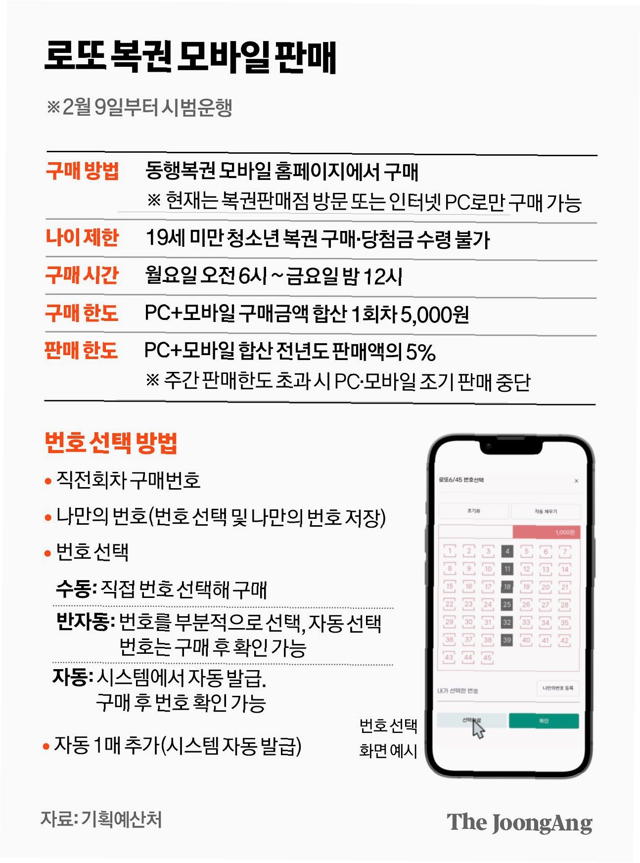 시범 운영 기간인 올해 상반기에는 평일(월~금요일)에만 회차당 5000원까지 구매가 가능하며, 모바일을 포함한 전체 온라인 판매 금액은 전년도 로또 판매액의 5%로 제한됩니다. 정부는 시범 운영 기간 나타난 문제점을 보완하여 올 하반기부터 모바일 로또 판매를 본격 도입할 계획이며, 온오프라인 상생 방안을 마련해 제도를 정착시킨다는 방침입니다.