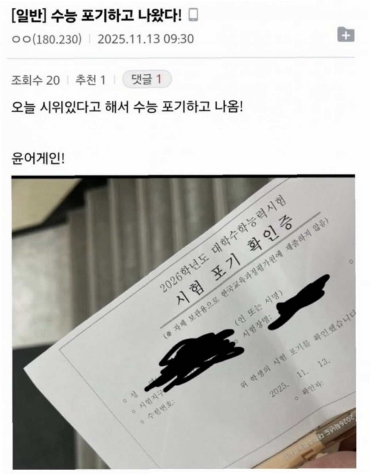 온라인 커뮤니티에는 ‘수능 포기’를 인증하는 게시글이 올라왔습니다. 한 수험생은 ‘윤 어게인’ 집회 참여를 위해 시험을 포기했다고 밝혔습니다. 시험 중 퇴실 시에는 ‘시험 포기 확인증’을 작성하고 휴대전화를 돌려받은 후 퇴실이 가능합니다. 이러한 사례는 수험생들이 시험 외적인 요인으로 인해 시험을 포기하는 현실을 보여줍니다.