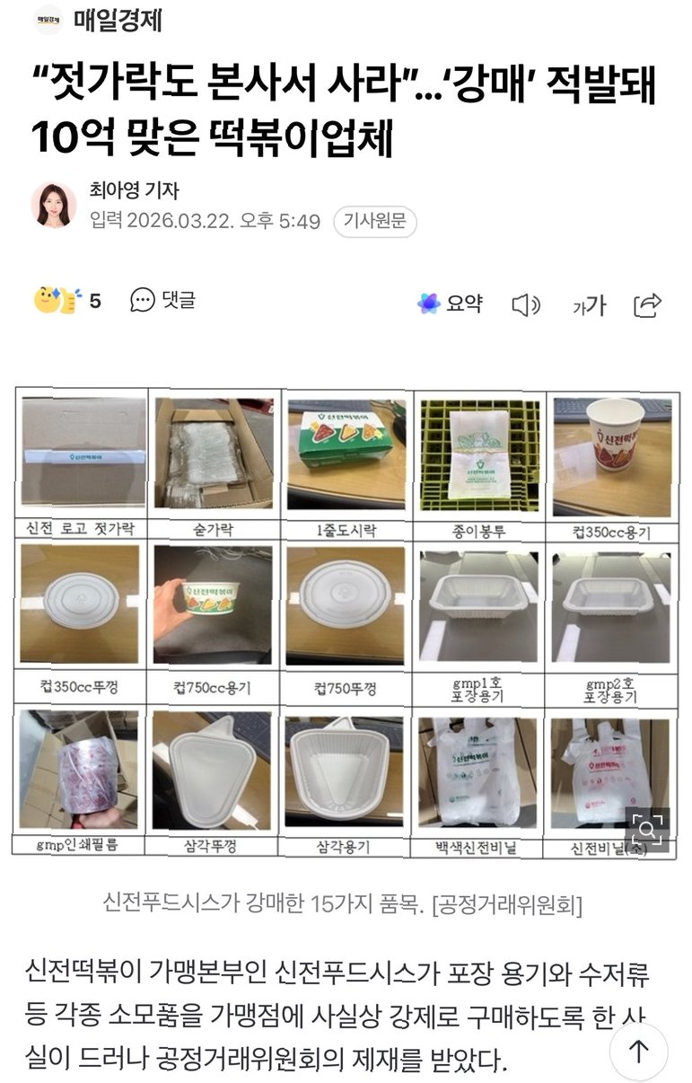 공정위에 따르면, 신전푸드시스는 15종의 공산품을 정보공개서에 거래 강제 품목으로 명시하지 않은 채 가맹점주들에게 본사 또는 지역 본부를 통해 구매하도록 강요했습니다. 이를 따르지 않을 경우 계약 해지 및 손해배상을 경고하는 내용증명을 2021년 3월부터 2023년 6월까지 59개 가맹점에 총 70차례 발송했습니다. 또한, 2023년 3월부터는 '사입품 체크리스트'를 도입하여 외부 구매 여부를 점검하는 등 적발 체계를 구축했습니다. 이 기간 동안 신전푸드시스는 해당 품목 판매로 12.5~34.7%의 마진을 붙여 약 6억 3000만원 이상의 이익을 거둔 것으로 조사되었습니다. 공정위는 강제품목이 수저, 봉투 등 일반 공산품으로 음식의 맛이나 품질에 직접적인 관련이 없고 시중 제품과 유의미한 차이가 없다고 판단했습니다.