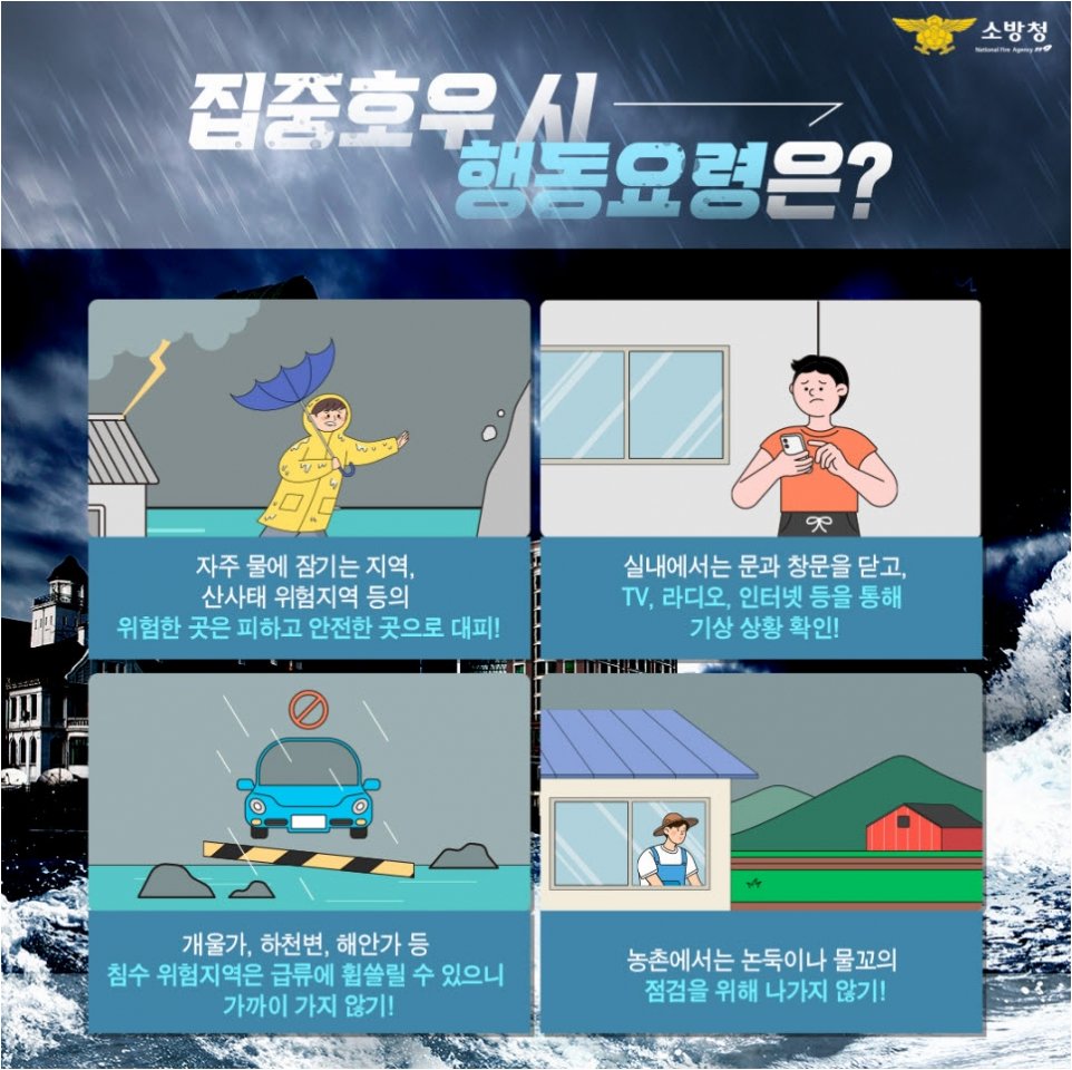 A.기상 정보 확인, 안전 수칙 준수, 침수 위험 지역 대비, 위험 시설물 접근 금지, 언론 보도 및 공식 정보 신뢰 등이 필요합니다.