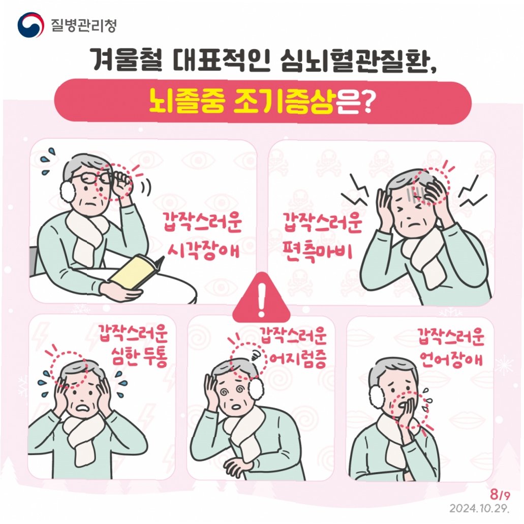A.한쪽 얼굴·팔·다리 힘 빠짐, 말이 어눌해짐, 시야 장애, 극심한 두통 등이 나타날 수 있습니다.