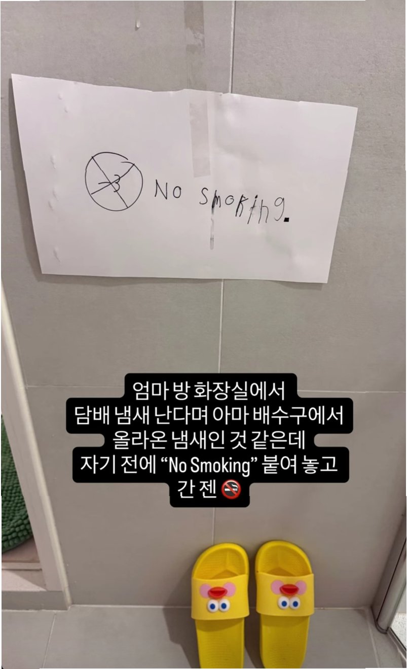 A.젠은 엄마 방 화장실에서 나는 담배 냄새를 맡고, 건강한 환경을 위해 'No Smoking' 문구를 직접 붙이며 지적했습니다.