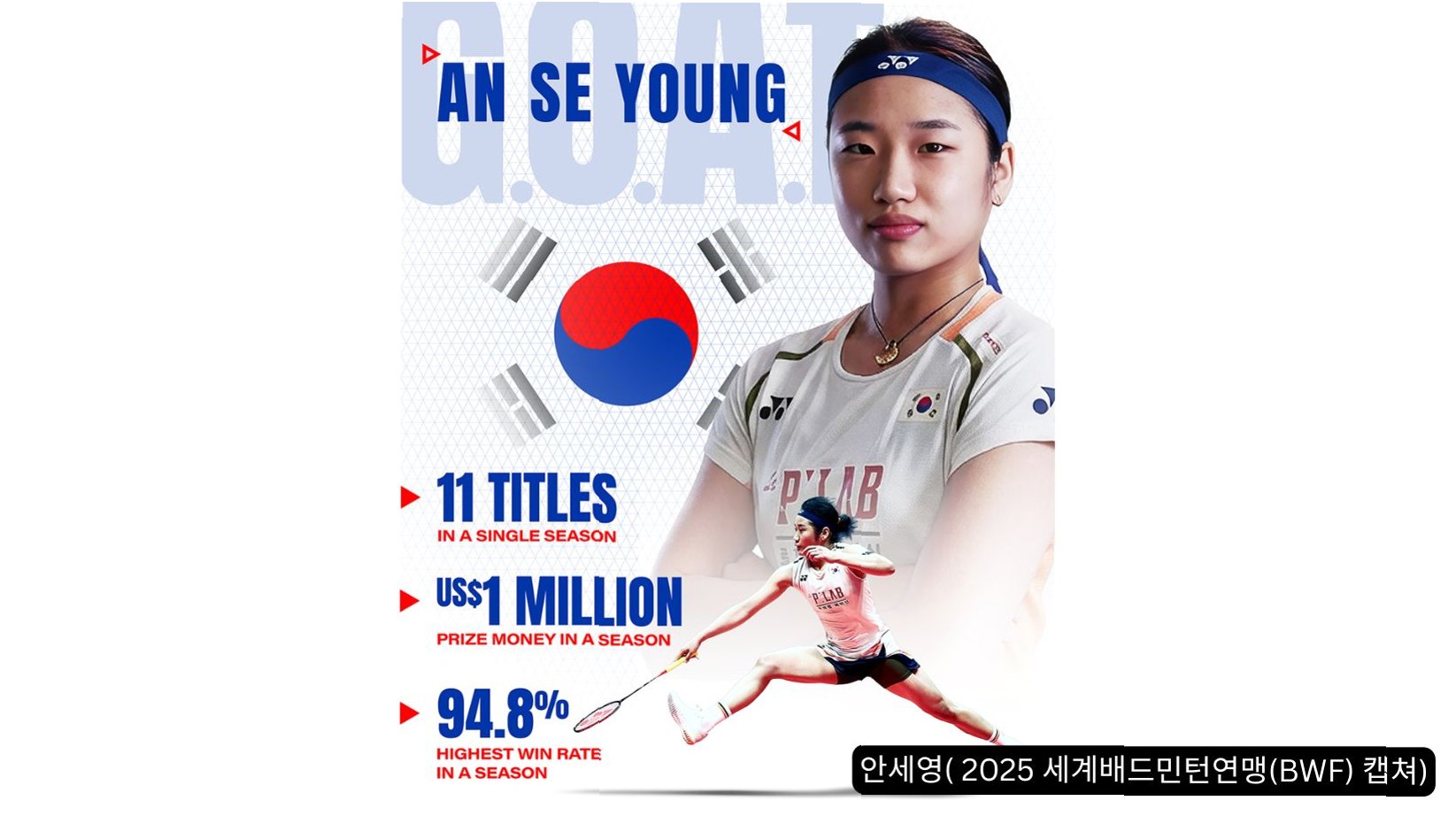 삼성생명 소속인 안세영 선수는 2002년생이라는 젊은 나이에도 불구하고 세계 랭킹 1위를 유지하고 있는 한국 배드민턴의 간판입니다. 뛰어난 수비력, 끈질긴 랠리, 그리고 탁월한 경기 운영 능력이 강점으로 꼽히며, 최근에는 공격력까지 강화되어 '완성형 선수'로 평가받고 있습니다. 지난 시즌에는 국제대회 11승과 함께 단일 시즌 상금 100만 달러를 돌파하는 등 배드민턴 역사에 굵은 발자취를 남겼습니다.