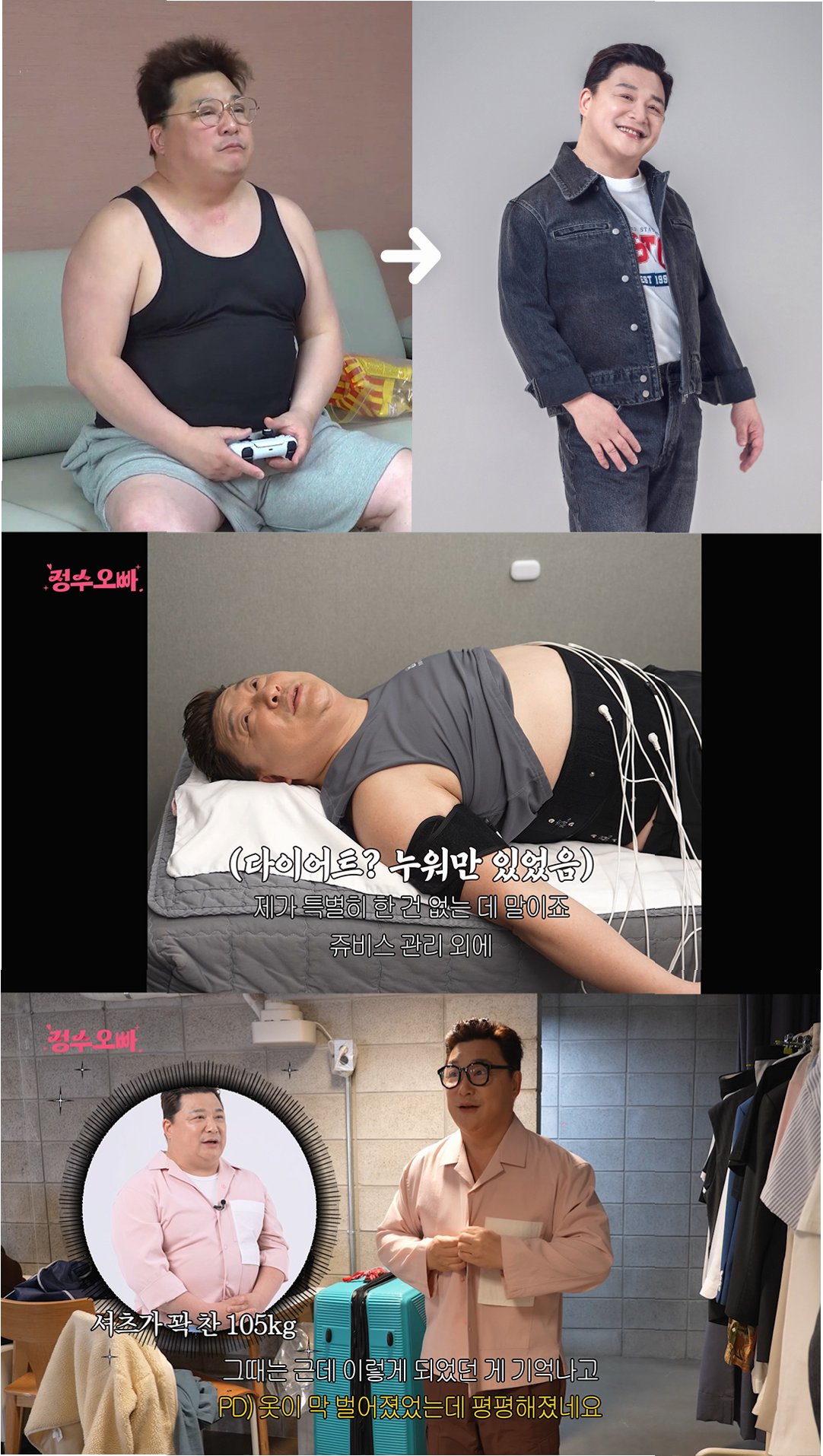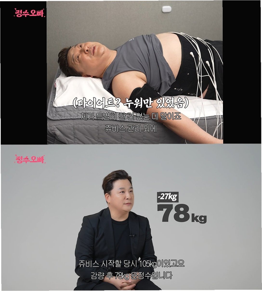 윤정수는 쥬비스 다이어트 유튜브 채널을 통해 다이어트 과정을 공개했습니다. ‘105kg→78kg. 7,8년 전 옷을 꺼내 입은 남자?! 새신랑 윤정수의 충격적인 다이어트 근황’이라는 제목의 영상을 통해, 세 자리 수 몸무게에서 감량하는 과정을 상세히 설명했습니다. 그는 다이어트 시작 전 ‘아저씨’ 같았던 모습에서 현재는 ‘누군가의 오빠’로 불릴 정도로 젊어진 외모를 자랑하며, 다이어트의 긍정적인 변화를 보여주었습니다.