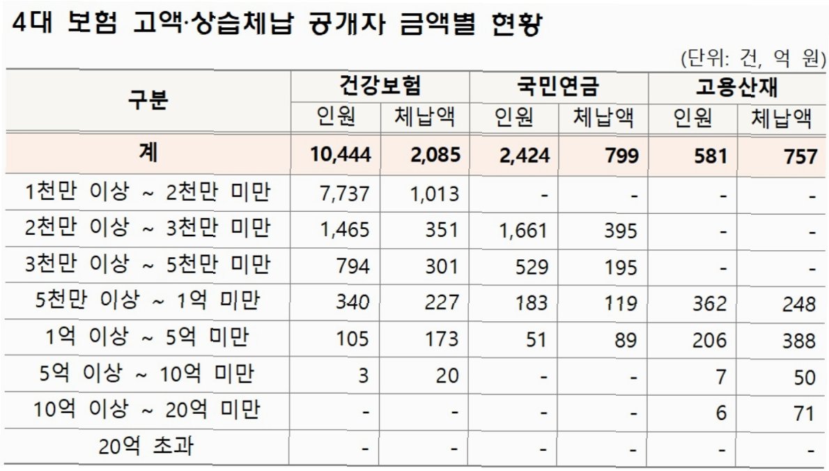 국민건강보험공단은 건강보험, 국민연금, 고용·산재보험료를 장기간 체납한 고액 체납자 1만 3000여 명의 인적 사항을 공개했다. 이번 공개는 체납 규모가 수천만 원에서 수십억 원에 달하는 이들을 대상으로 하며, 연예인들도 명단에 포함되어 사회적 파장을 일으키고 있다. 공개 대상은 지난해 12월 31일 기준으로 납부 기한이 1년 이상 경과한 체납자들이다.