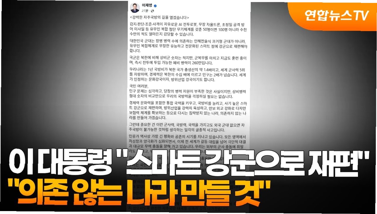 이재명 대통령은 21일 자신의 페이스북을 통해 '강력한 자주국방의 길을 열겠습니다'라는 제목의 글을 게시하며, 자주국방의 중요성을 강조했습니다. 그는 “외국 군대 없으면 자주국방이 불가능한 것처럼 생각하는 일각의 굴종적 사고”를 비판하며, 강력한 국방개혁을 통해 완전한 자주국방 태세를 갖추겠다고 밝혔습니다. 이 대통령의 이러한 발언은 최근 병역자원 감소에 대한 우려가 제기되는 상황에서, 자주국방에 대한 확고한 의지를 드러낸 것으로 풀이됩니다.