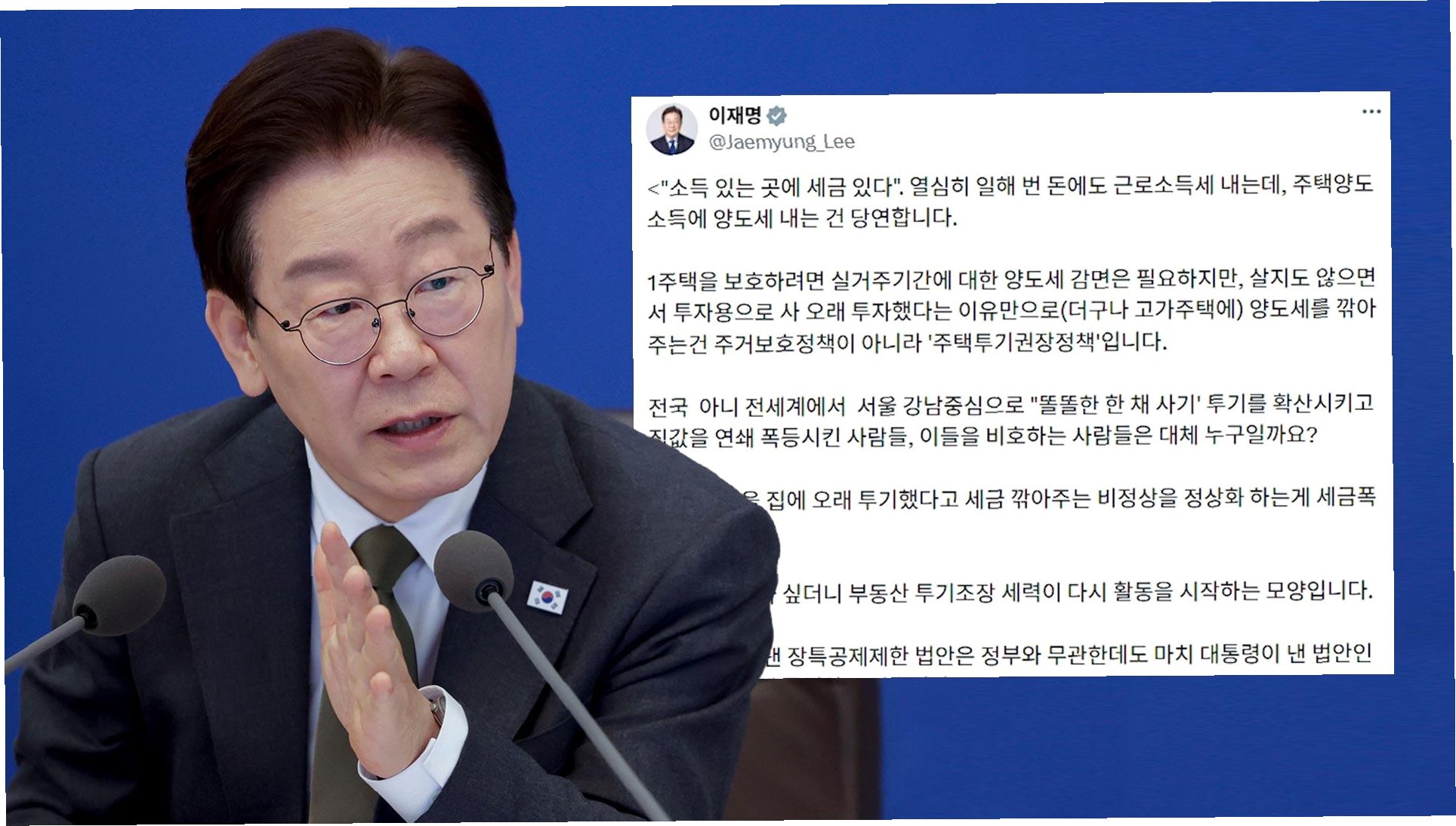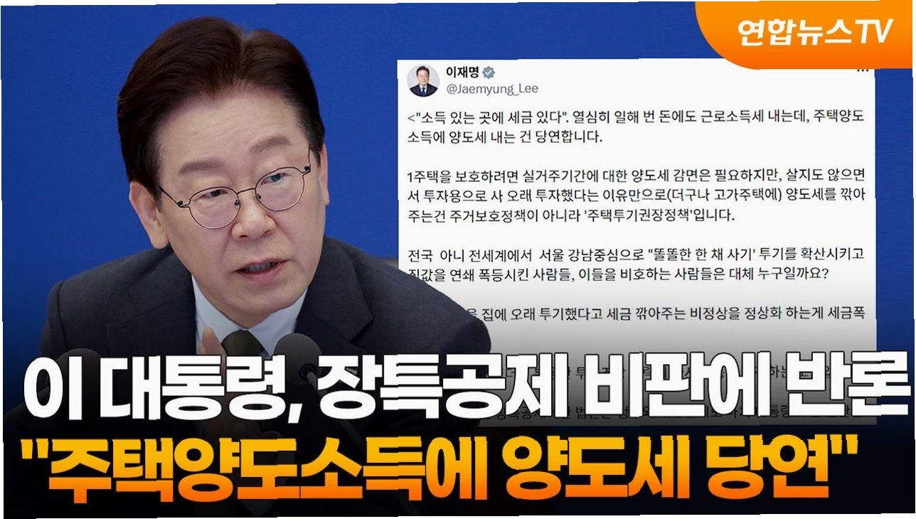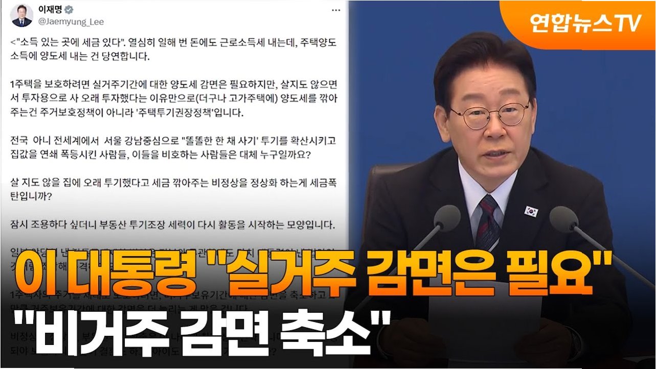 이재명 대통령은 실거주하지 않는 주택에 대한 양도세 감면이 주택 투기를 권장하는 정책이라고 강하게 비판했습니다. 대통령은 1주택 보호를 위해서는 실거주 기간에 대한 양도세 감면이 필요하지만, 살지 않으면서 투자 목적으로 오래 보유했다는 이유만으로, 특히 고가주택의 양도세를 깎아주는 것은 주거 보호가 아닌 투기 권장 정책이라고 지적했습니다. 이는 '소득이 있는 곳에 세금이 있다'는 원칙에도 어긋난다고 강조했습니다.