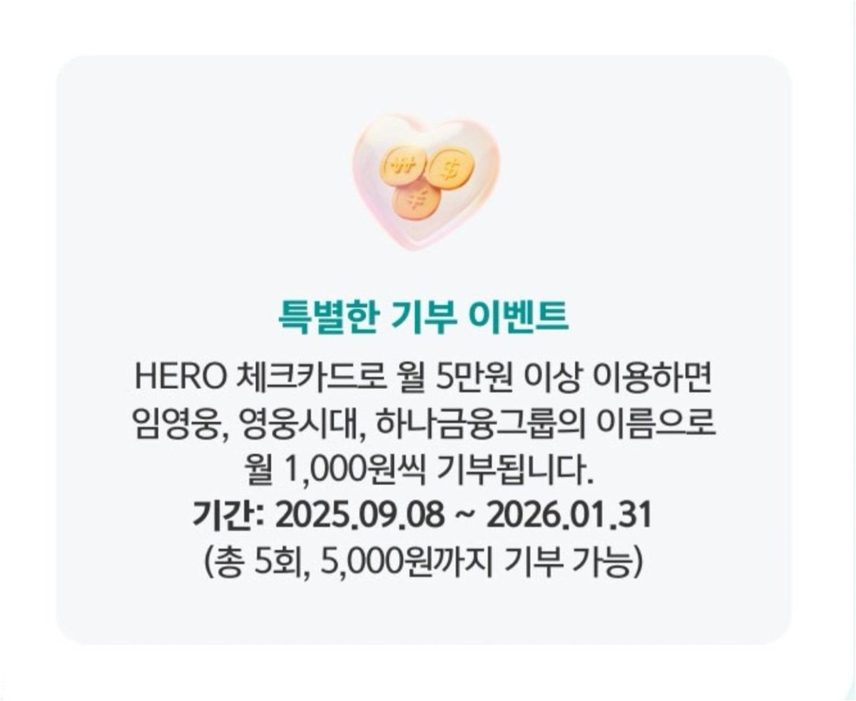 A.내년 1월 31일까지 HERO 체크카드로 월 5만원 이상 결제하면, 매월 1000원씩 최대 5000원이 임영웅, 영웅시대, 하나금융그룹 이름으로 기부됩니다.