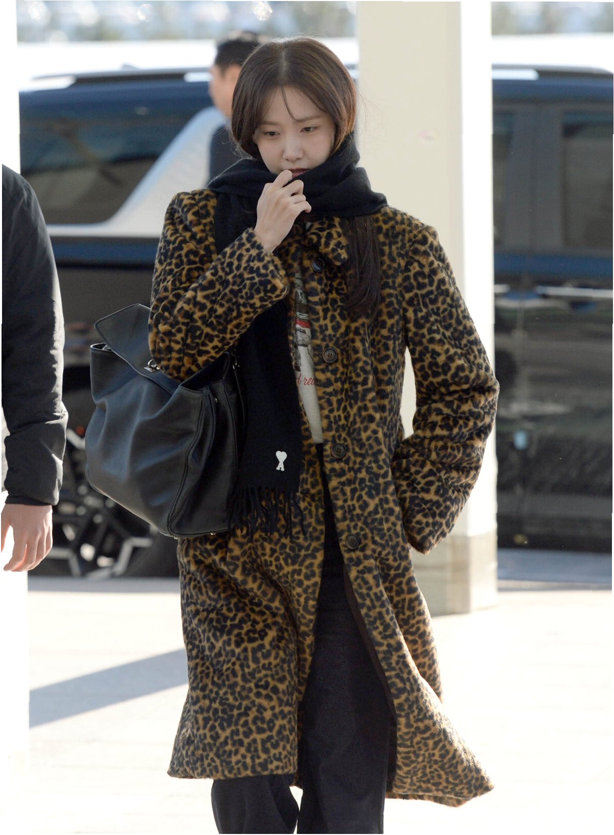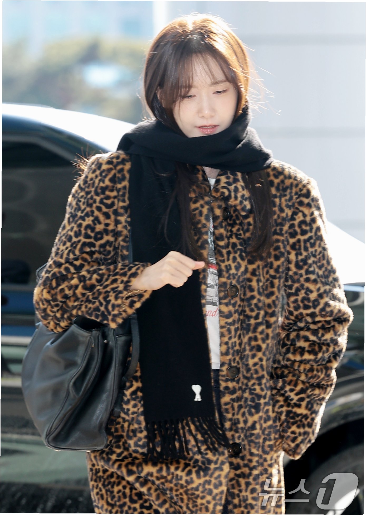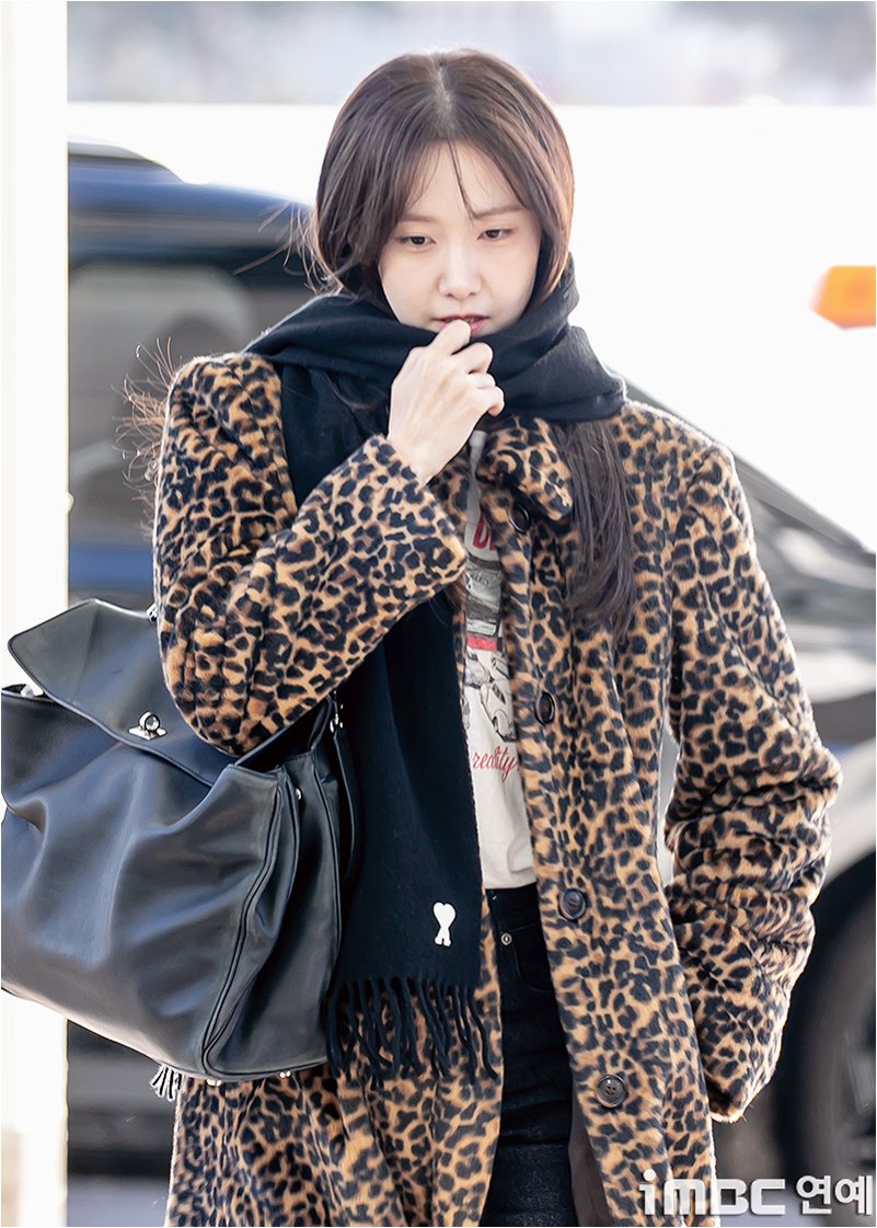 A.두툼한 레오파드 퍼 코트와 블랙 머플러입니다. 추운 날씨에도 스타일을 잃지 않는 윤아의 패션 센스를 엿볼 수 있습니다.