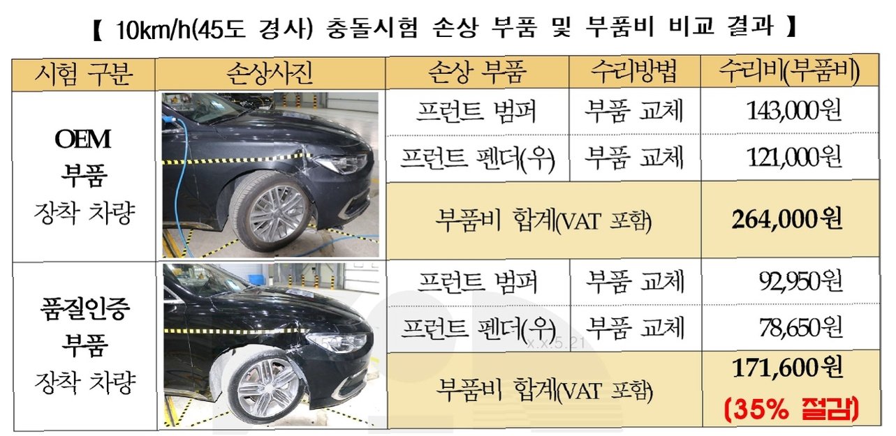 보험개발원의 시험 결과에 따르면, 품질 인증 부품은 시속 56km의 충돌 안전성 시험에서 OEM 부품과 동등한 성능을 보였습니다. 한국자동차부품협회 관계자는 '우수' 등급을 받았으며, 국토부 인증기관의 심사를 통과했기에 성능과 품질 면에서 차이가 없다고 강조했습니다.