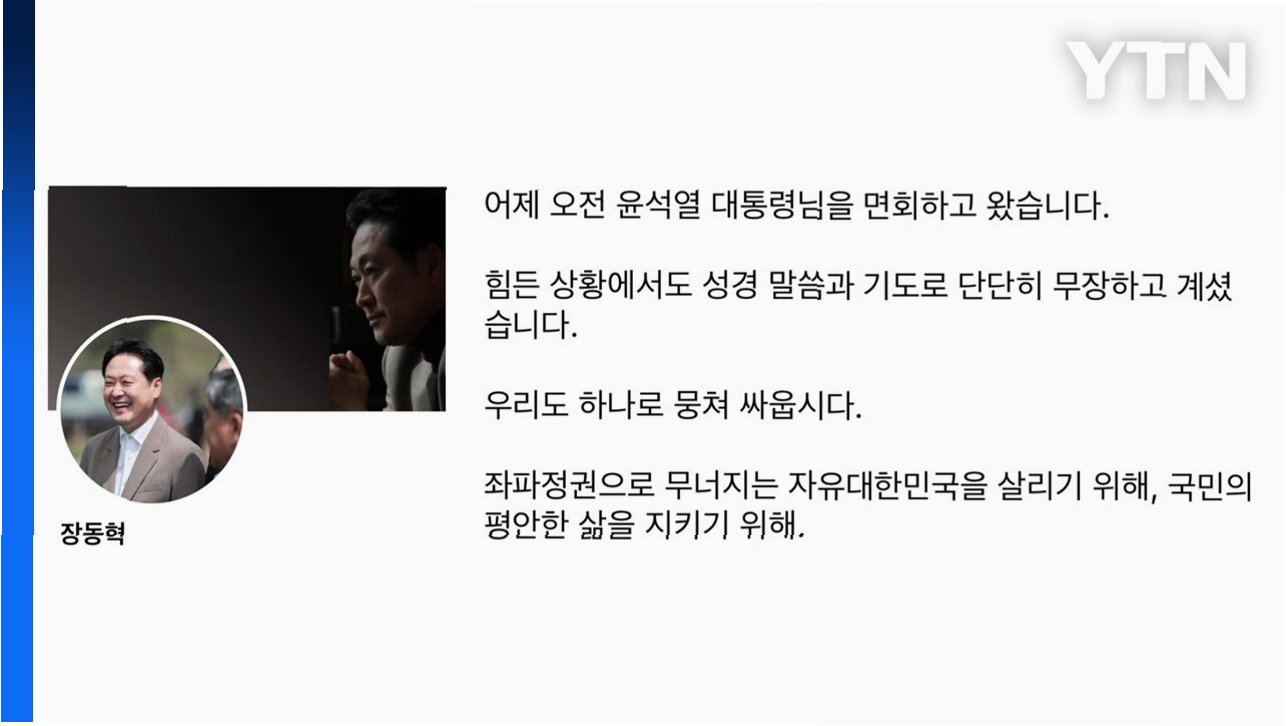 장동혁 대표는 면회 후 페이스북에 글을 올려 윤 전 대통령의 근황을 전했습니다글에 따르면, 윤 전 대통령은 어려운 상황 속에서도 성경 말씀과 기도로 마음을 다잡고 있는 것으로 알려졌습니다. 이는 윤 전 대통령이 굳건한 의지를 유지하고 있음을 시사합니다.