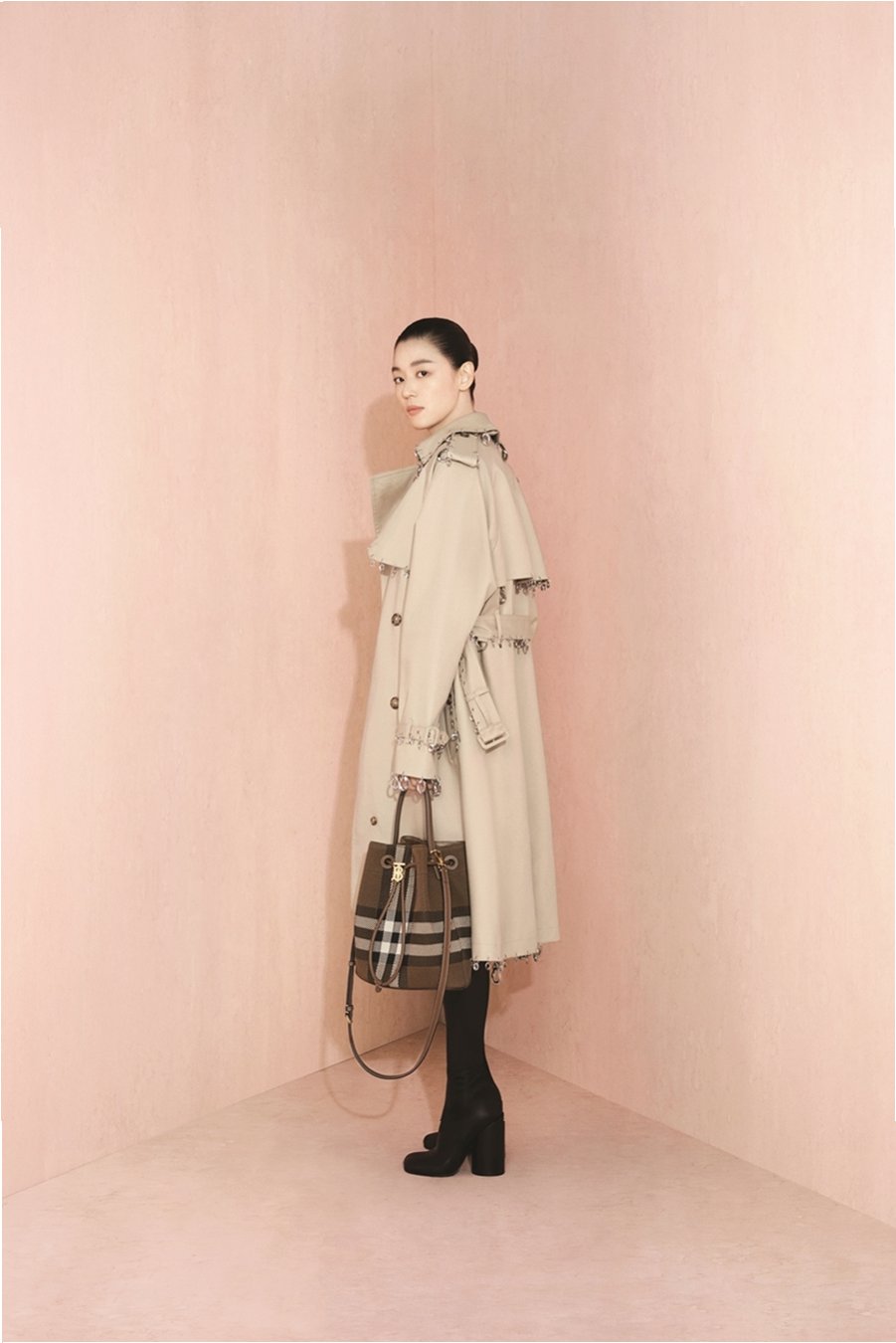 A.전지현은 회색과 버건디 패턴의 아방가르드 캡 퍼프 원피스와 블랙 가죽 앵클부츠를 매치하여 고급스러운 분위기를 연출했습니다.