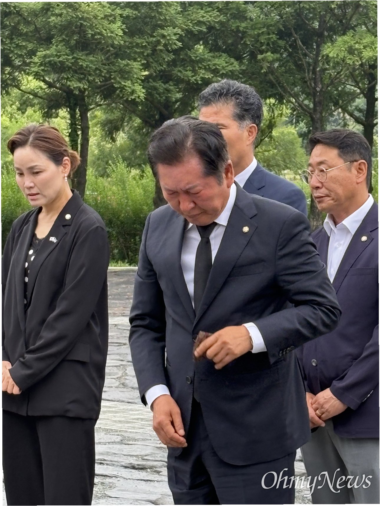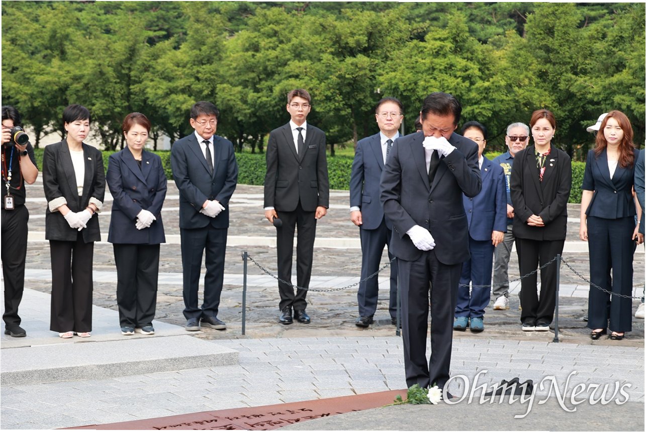 정 대표는 묘역에서 묵념을 하고 헌화하며 고인의 넋을 기렸습니다. 특히, '상록수'가 배경음악으로 흐르는 가운데, 정 대표는 눈을 감고 고개를 숙인 채 묵념하며 깊은 슬픔을 표현했습니다. 너럭바위 앞에서 신발을 벗고 헌화하는 모습에서는 진심 어린 존경심이 느껴졌습니다. 굳은 표정으로 큰절을 올리는 모습과 눈물을 훔치는 모습은 보는 이들의 마음을 울렸습니다.