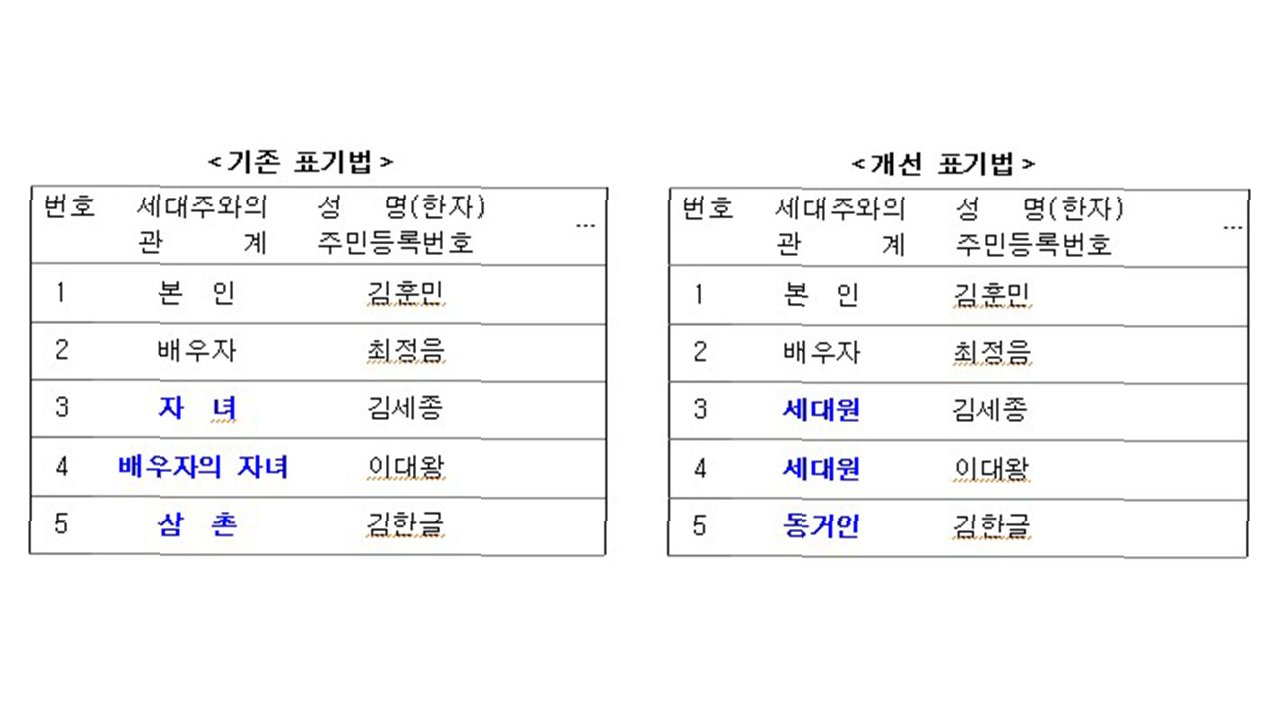 A.앞으로는 '배우자의 자녀'도 '세대원'으로 동일하게 표기됩니다. 이는 재혼가정의 사생활 보호를 강화하기 위한 조치입니다.