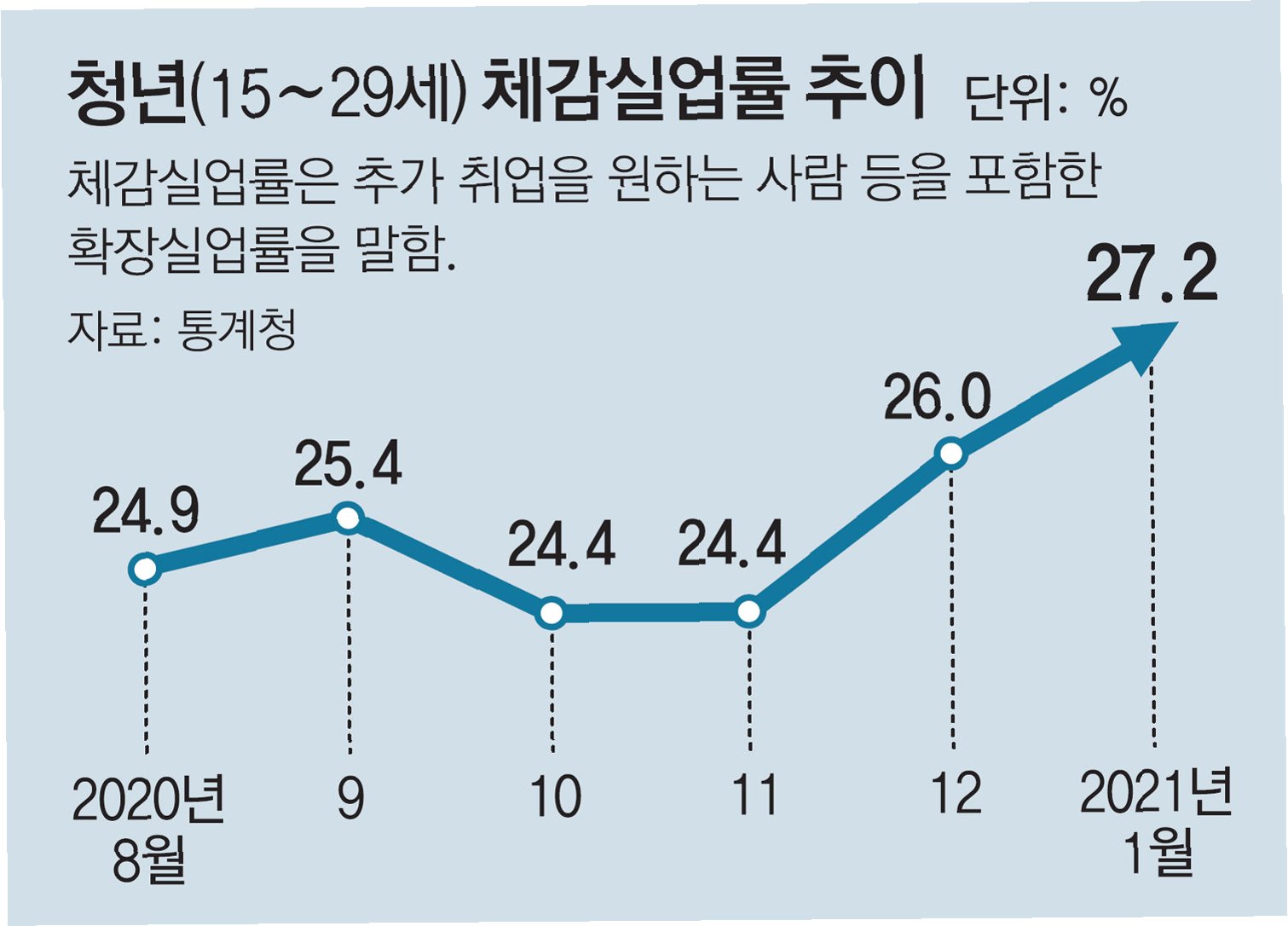 어두운 그림자: 청년 고용률, 17개월 연속 하락