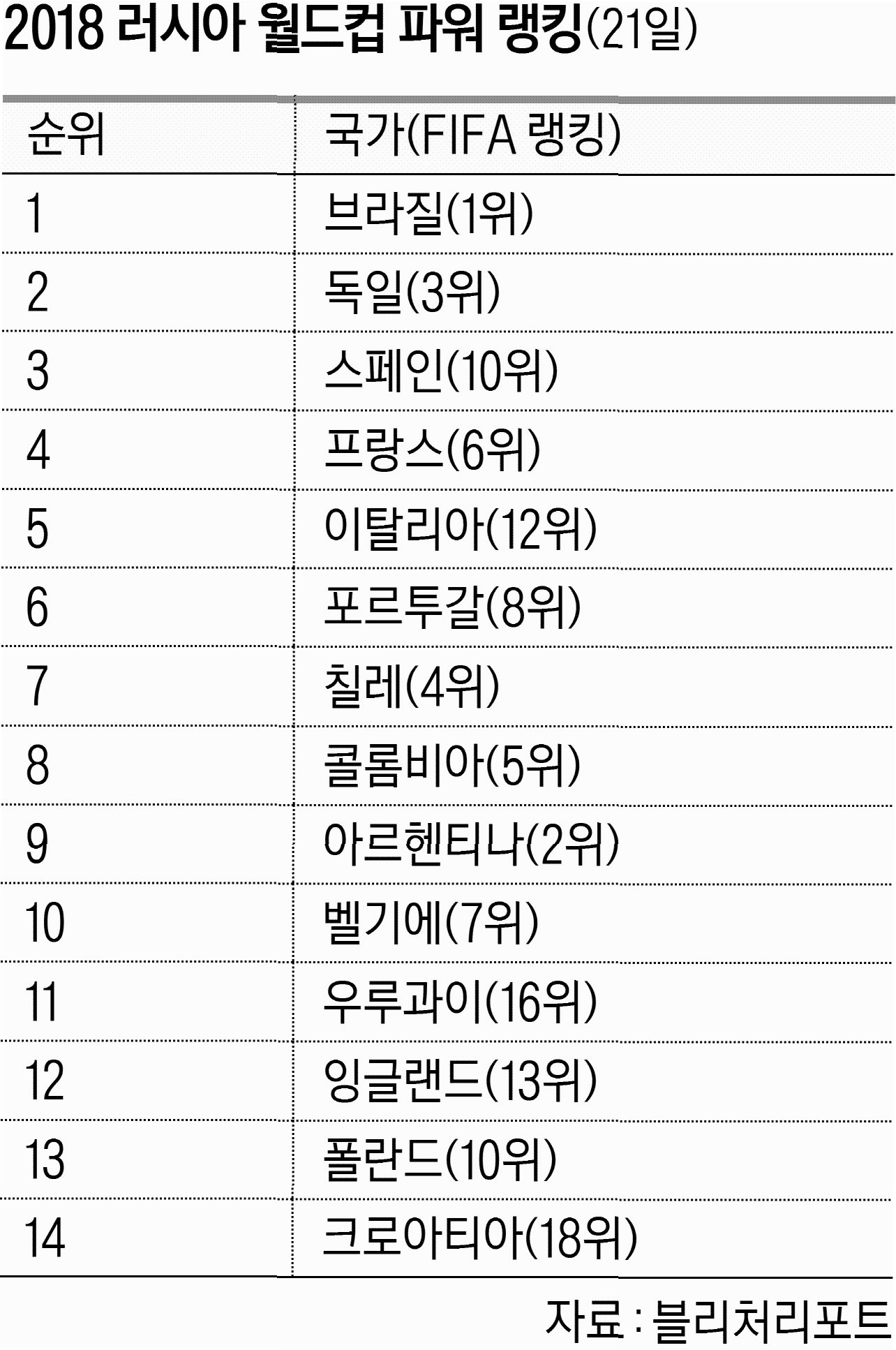 A.풋볼365는 한국의 견고한 예선 성적을 높이 평가했지만, 17위라는 순위는 다소 아쉬움을 남길 수 있습니다. 1982년 이후 월드컵을 놓친 적이 없지만, 다른 팀들의 전력 상승과 상대적인 평가에 따라 순위가 결정된 것으로 보입니다.