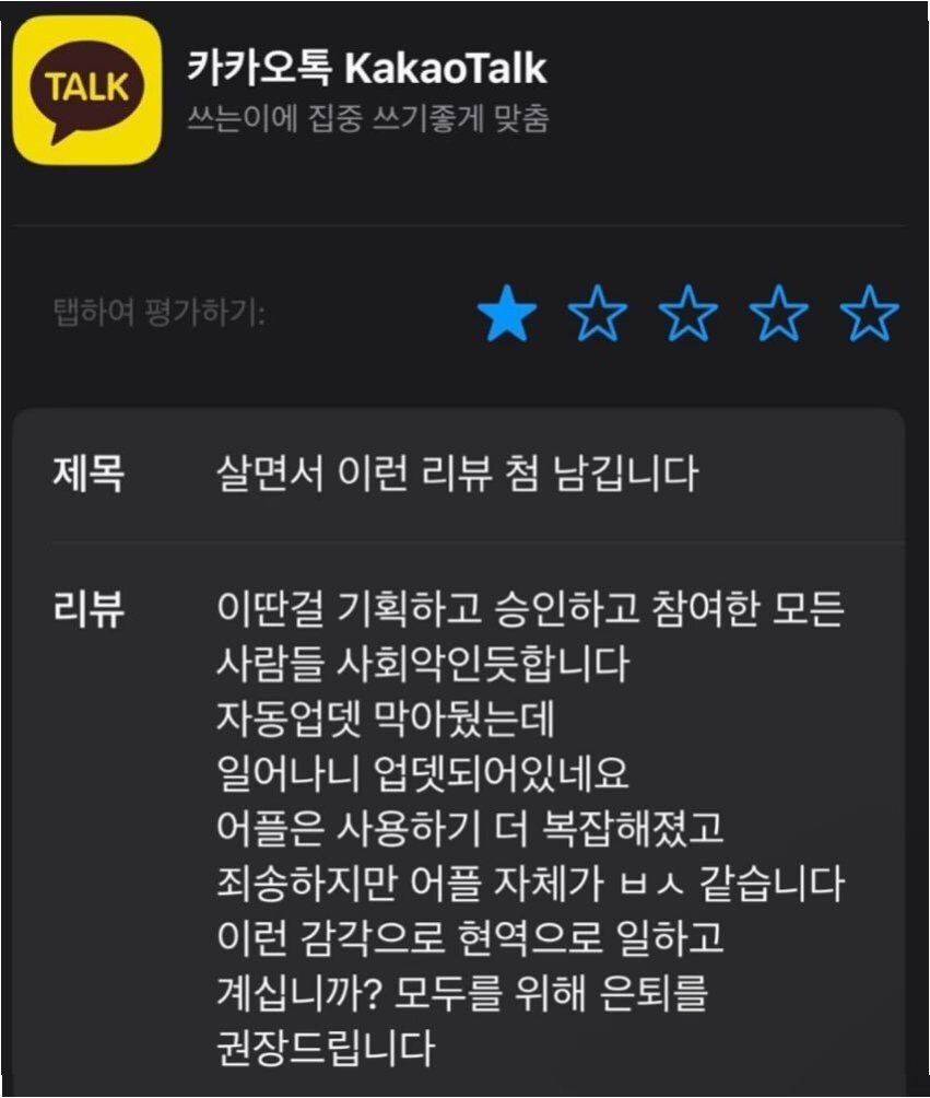 최근 카카오톡의 대규모 업데이트 이후, 사용자들의 불만이 폭발하며 '1점 리뷰'가 쏟아지고 있습니다. 구글 플레이스토어와 애플 앱스토어에서 사용자들은 업데이트에 대한 실망감을 여과 없이 드러내고 있으며, 카카오톡의 변화에 대한 불만을 표출하고 있습니다. 이번 업데이트는 사용자 인터페이스(UI)와 디자인, 친구 목록 및 프로필, 광고 증가 등 다양한 측면에서 사용자 경험을 저하시켰다는 평가를 받고 있습니다. 이러한 부정적인 반응은 카카오 주가 하락으로 이어졌으며, IT 업계의 관심이 집중되고 있습니다.