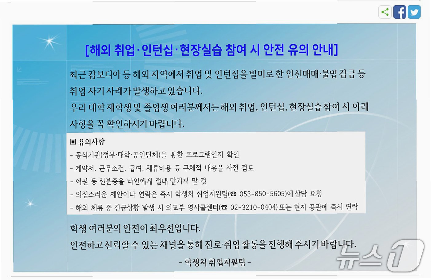 A.해외 취업 시 안전 정보 확인, 불법적인 일에 연루되지 않도록 주의, 범죄 피해 시 즉시 신고 등입니다.
