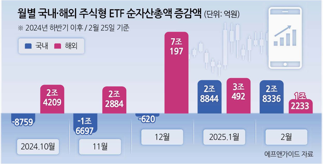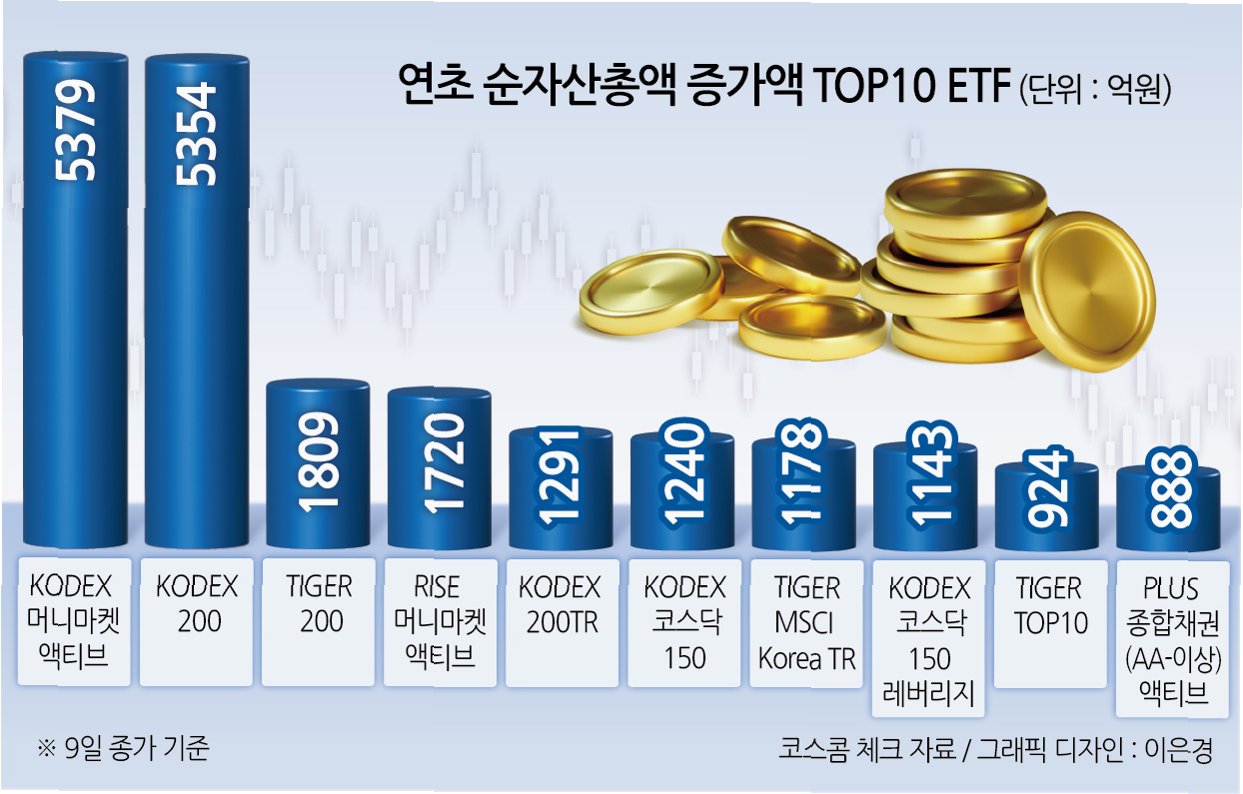 코스피 ETF로의 자금 쏠림 현상은 더욱 심화되고 있습니다. 코스피200 지수 추종 ETF 25개의 올해 순자산은 12조 4000억원 증가했으며, 순자산 증가율은 89.4%에 달합니다. 반면, 코스닥150 ETF 8개 종목의 순자산은 2005억원 증가에 그쳤고, 순자산 증가율도 13.8%에 불과합니다. 이는 국내 주식 시장에 대한 투자 심리가 코스피 대형주에 집중되어 있음을 보여줍니다.