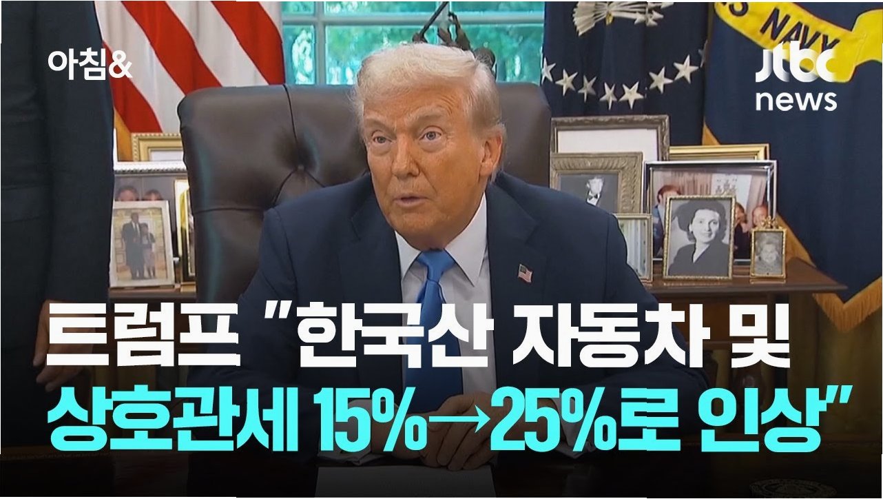 트럼프 대통령이 한국 국회의 무역 합의 비준 지연에 대해 강한 불만을 표하며, 한국산 자동차 등 주요 품목에 대한 관세를 25%로 인상하겠다고 경고했습니다. 이는 양국 간 투자 협정 이행의 중요성을 강조하며, 향후 통상 관계에 대한 불확실성을 높이고 있습니다.