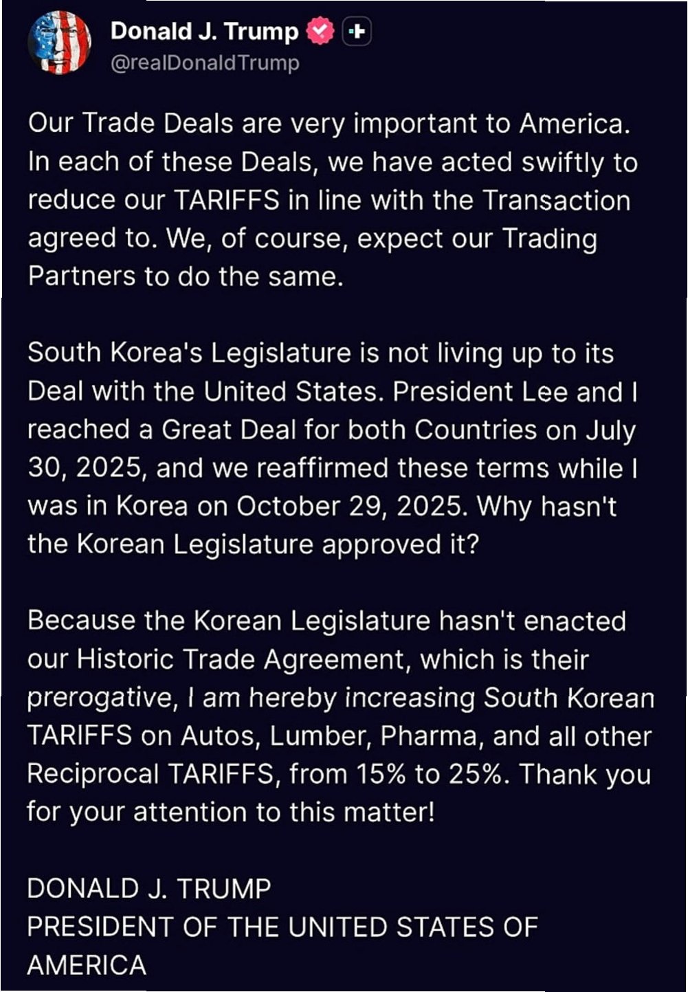 도널드 트럼프 미국 대통령이 한국산 자동차, 목재, 의약품 등에 대한 관세를 기존 15%에서 25%로 즉각 인상하겠다고 밝혔습니다. 이는 한국 국회가 한미 간 무역 합의를 비준하지 않고 있는 점에 대한 불만 표출로 해석됩니다. 트럼프 대통령은 트루스소셜을 통해 “대한민국 국회가 미국과의 협정을 이행하지 않고 있다”며, “우리의 무역 합의는 미국에게 매우 중요하다”고 강조했습니다. 그는 양국 모두에게 유리한 협정을 체결했음에도 불구하고 한국 국회의 비준 지연에 대해 강한 불만을 드러냈습니다.