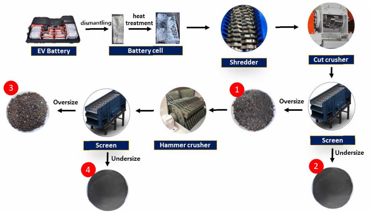 A.폐배터리를 수거하여 방전시킨 후 파쇄하여 블랙 매스를 얻습니다. 이 블랙 매스에서 리튬, 니켈, 코발트 등 금속 자원을 추출하여 정제 과정을 거쳐 배터리 소재로 재활용합니다.